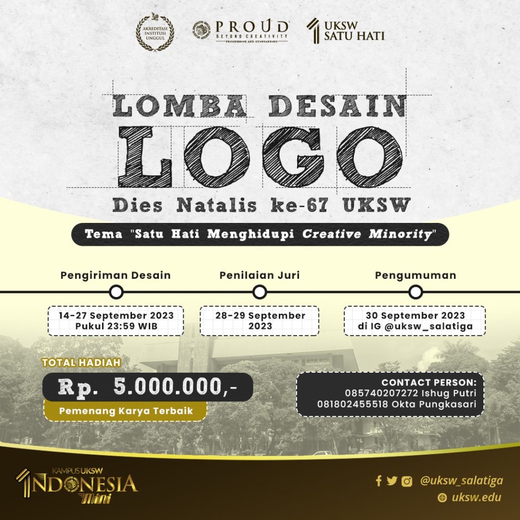 Dalam rangka menyambut Dies Natalis ke-67, Pimpinan UKSW menyelenggarakan Lomba Desain Logo Dies Natalis ke-67 UKSW dengan tema “Satu Hati Menghidupi Creative Minority”. Untuk pemenang karya terbaik akan memperoleh hadiah senilai 5 juta rupiah. Timeline Lomba: Pengumpulan Karya : 14-27 September 2023 Penilaian Juri : 28-29 September 2023 Pengumuman Pemenang : 30 September 2023 Kriteria […]