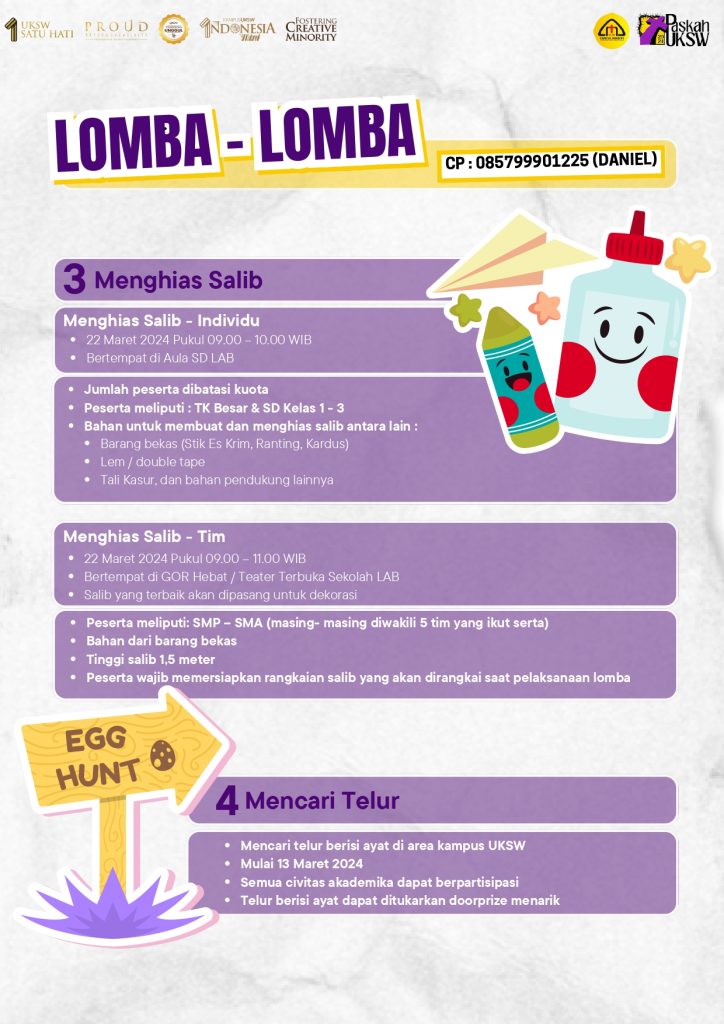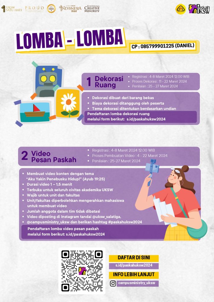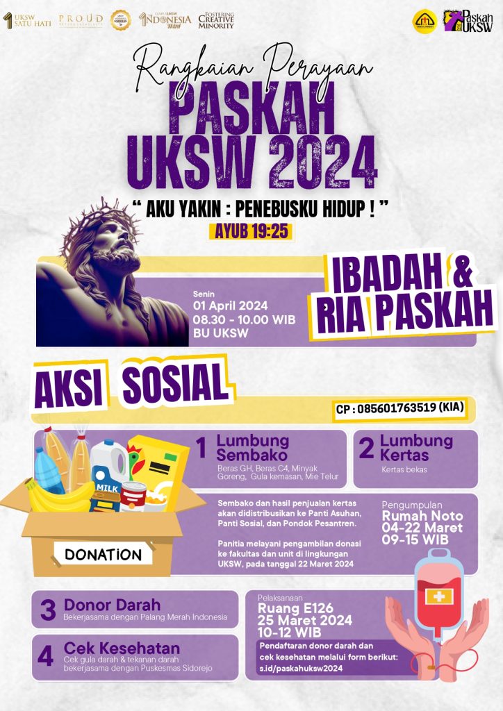 Perayaan Paskah UKSW 2024 Campus Ministry menginformasikan Rangkaian Perayaan Paskah UKSW 2024 sebagai berikut: (CM/Ish) The event is finished. Search for: Recent Posts Wisuda UKSW 2026: Rektor Ingatkan 642 Lulusan pada Superhero di Balik Toga dan Semangat Pantang Menyerah Executive Meeting with the Ministry of Religious Affairs Wapres Gibran Apresiasi UKSW, Konsisten Kirim Mahasiswa Berlaga di Kompetisi Internasional Dari Talkshow Hingga Tanam Pohon, Wapres Gibran Kunjungi Kampus Hijau UKSW Wapres Gibran Kunjungi Expo Produk Inovasi UKSW: Karya Creative Minority di Kompetisi Dunia Archives February 2026 January 2026 December 2025 November 2025 October 2025 September 2025 August 2025 July 2025 June 2025 May 2025 April 2025 March 2025 February 2025 January 2025 December 2024 November 2024 October 2024 September 2024 August 2024 July 2024 June 2024 May 2024 April 2024 March 2024 February 2024 January 2024 December 2023 November 2023 October 2023 September 2023 August 2023 July 2023 June 2023 Categories Banner Berita Cerita Sukses CSR-CMR Dosen Praktisi Kebijakan KKN/PKLBerdampak MagangBerdampak PemberdayaanBerdampak Pengumuman PKMBerdampak Prestasi Promosi RisetdanInovasiBerdampak SDGs UKSW Bangga UKSWBerdampak Uncategorized WirausahaBerdampak