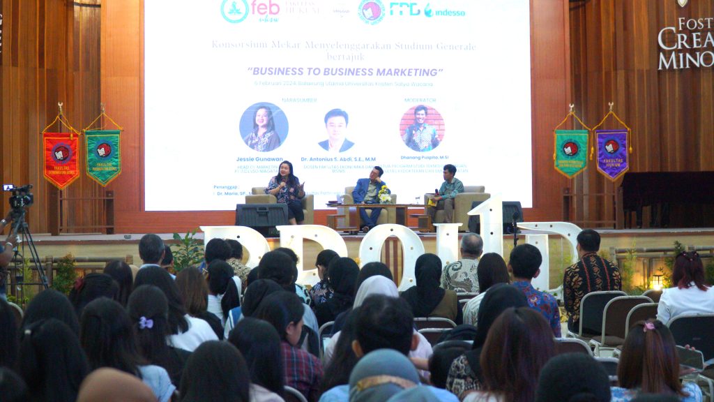 Universitas Kristen Satya Wacana (UKSW) melalui Konsorsium Mengutamakan Karya (MEKAR) yang terdiri dari Fakultas Kedokteran dan Ilmu Kesehatan (FKIK), Fakultas Hukum, Fakultas Ekonomika dan Bisnis (FEB) serta Fakultas Pertanian dan Bisnis (FPB) kembali menggelar Studium Generale, Selasa (06/02/2024) di Balairung Universitas. Kegiatan yang bertajuk “Business to Business Marketing” ini dihadiri sedikitnya 306 peserta.