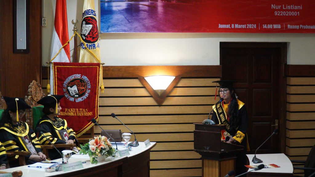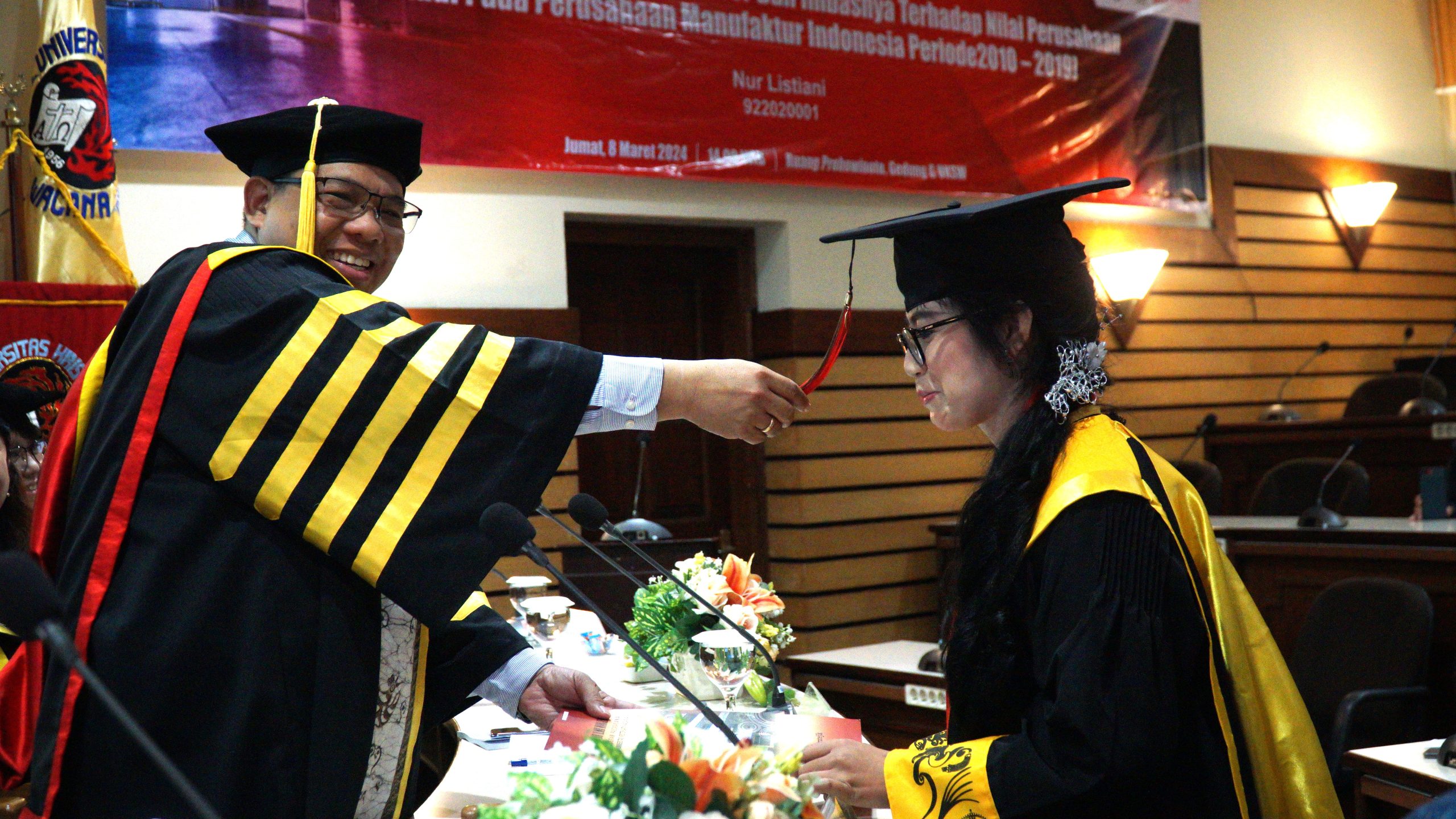 Pada Jumat (08/03/2024) sore, wanita yang berprofesi dalam bidang wirausaha ini menjalani yudisium Prodi Doktor Manajemen FEB. Sidang yudisium dipimpin oleh Dekan FEB Dr. Yefta Andi Kus Noegroho, S.E., M.Si., Akt., di Ruang Probowinoto Gedung G.