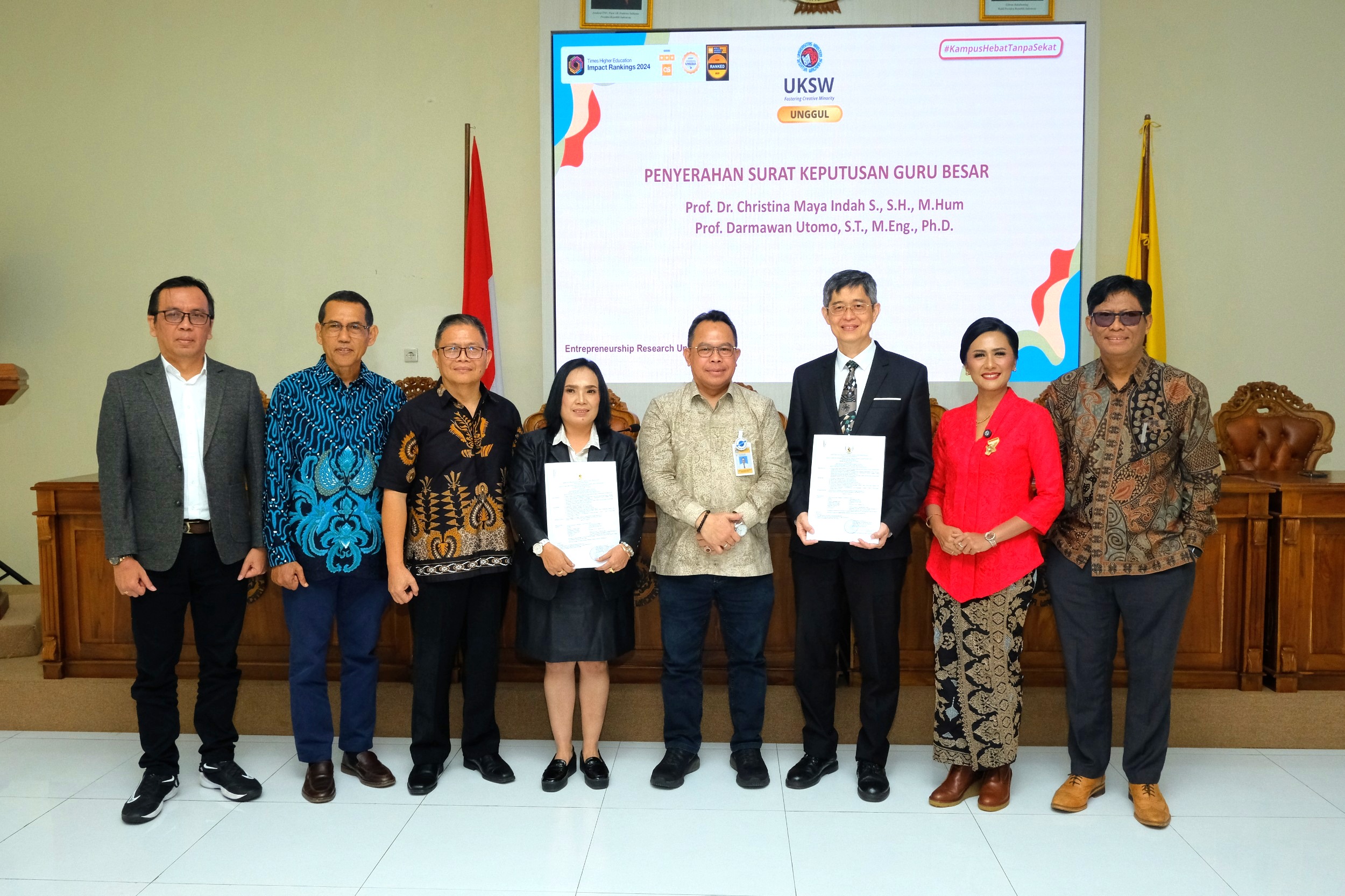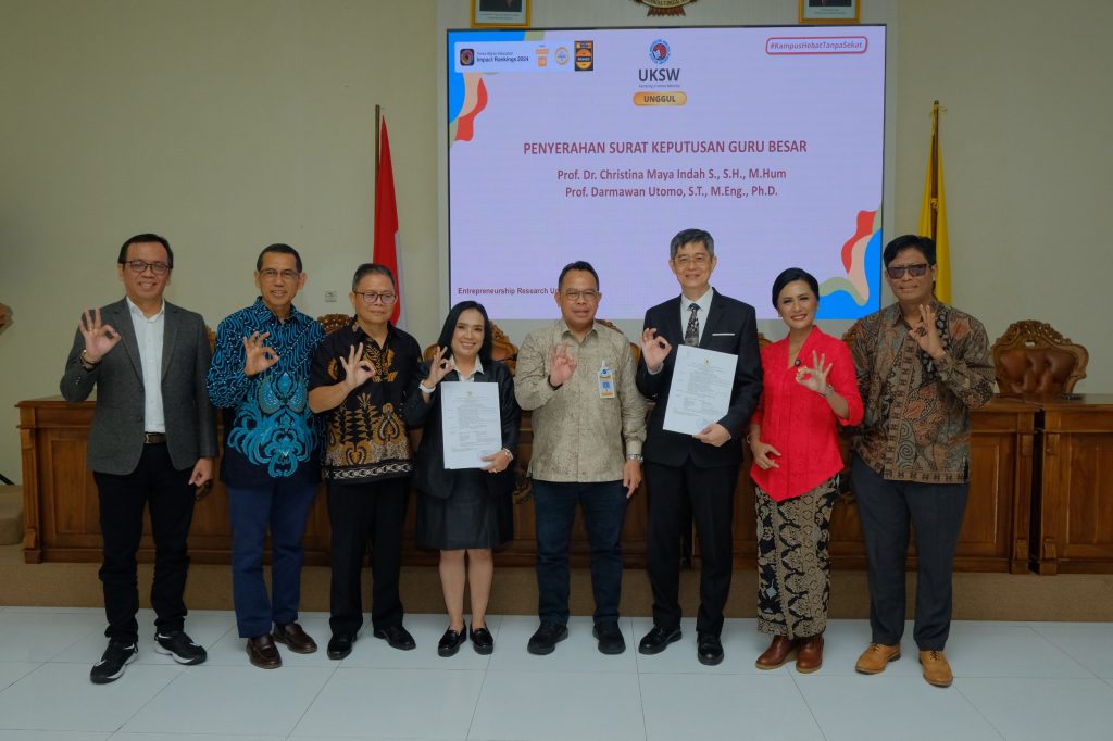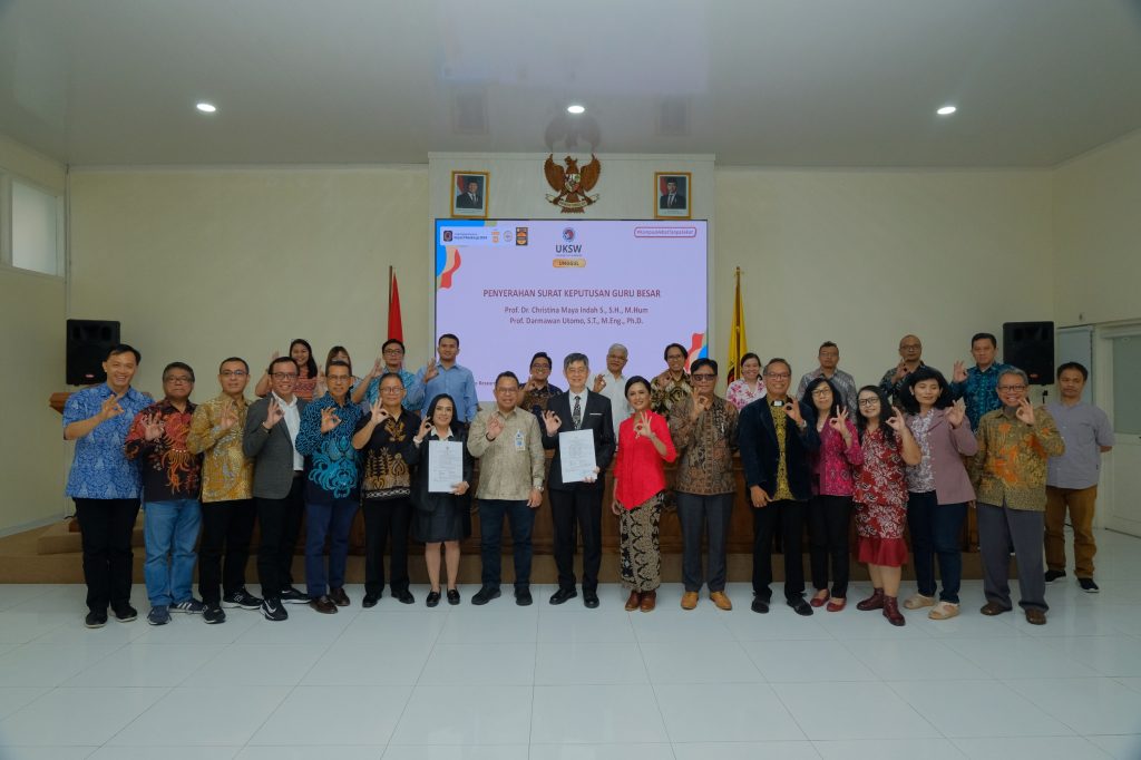 Universitas Kristen Satya Wacana (UKSW) kembali berhasil menunjukkan kualitas unggul dengan diperolehnya 2 Guru Besar baru. Kedua Surat Keputusan (SK) tersebut atas nama Prof. Dr. Christina Maya Indah, S.H., M.Hum., dari Fakultas Hukum (FH) dan Prof. Darmawan Utomo, M.Eng., Ph.D., dari Fakultas Teknik Elektronika dan Komputer (FTEK).