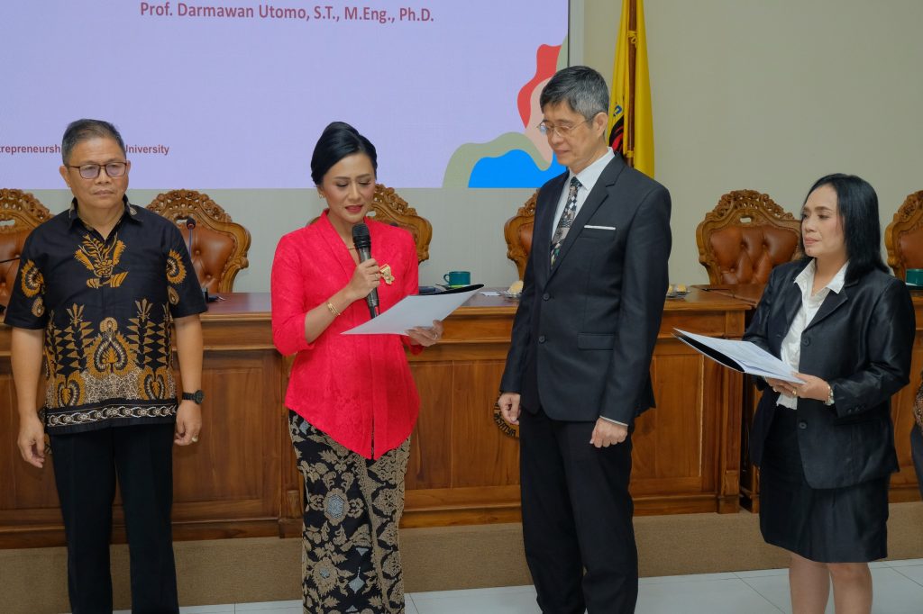 “Kepada dua Guru Besar yang baru, semoga bisa selalu menjaga integritas dan komitmennya, serta menjadi contoh dan inspirasi bagi dosen lainnya sesuai bidang ilmunya,” kata Dr. Bhimo Widyo Andoko.