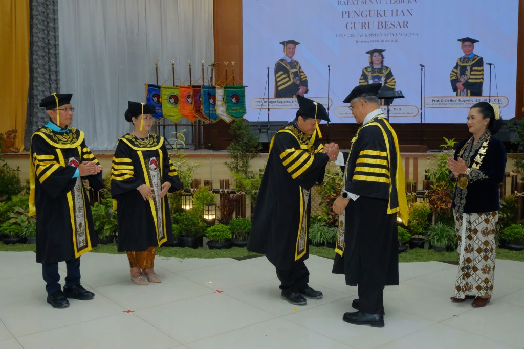 Universitas Kristen Satya Wacana (UKSW) kembali menambah deretan guru besar dengan dikukuhkannya Prof. Dr. Agus Sugiarto, S.Pd., M.M., sebagai Guru Besar dalam bidang Ilmu Manajemen di Fakultas Ekonomika dan Bisnis (FEB). Upacara pengukuhan yang khidmat ini dilakukan oleh Rektor UKSW, Prof. Dr. Intiyas Utami, S.E., M.Si., Ak., di Balairung Universitas belum lama ini.