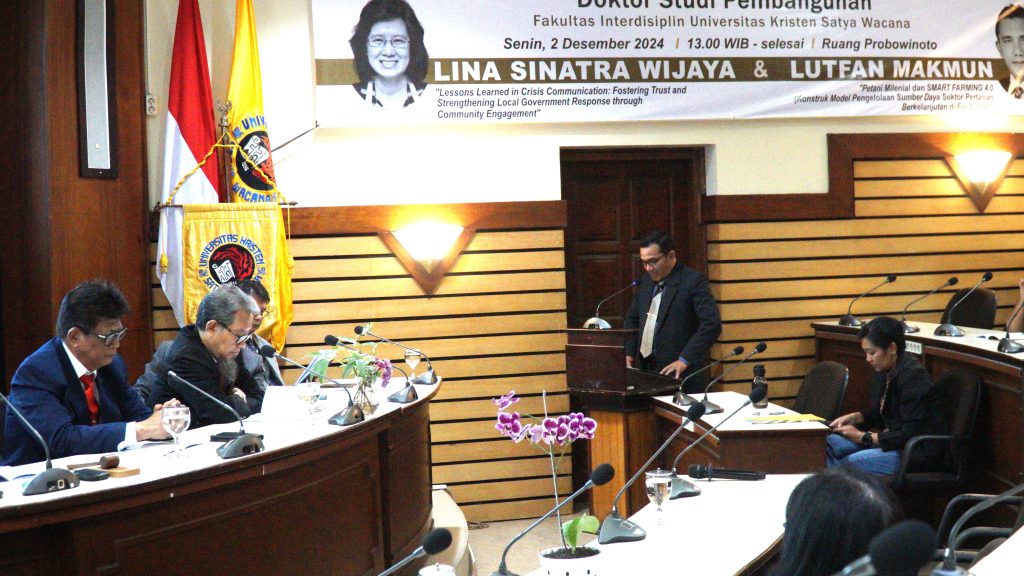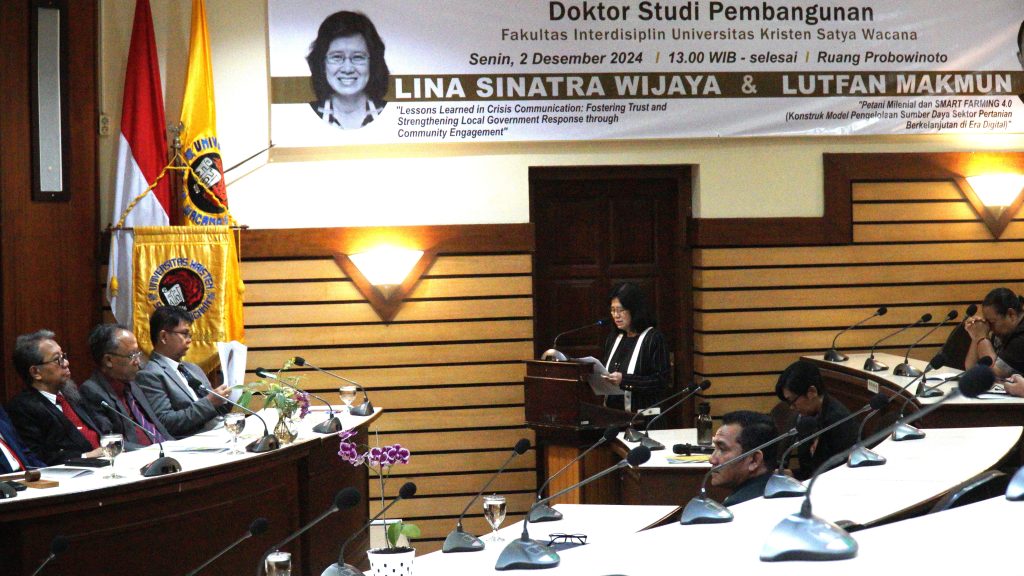 Lina Sinatra Wijaya, dosen Prodi Hubungan Masyarakat di Fakultas Teknologi Informasi (FTI) UKSW, menyajikan disertasi berjudul Lessons Learned in Crisis Communication: Fostering Trust and Strengthening Local Government Response through Community Engagement. Penelitian yang dikawal oleh promotor Pdt. Izak Y.M. Lattu, Ph.D., ini mengeksplorasi komunikasi publik selama pandemi Covid-19 di Kota Salatiga.