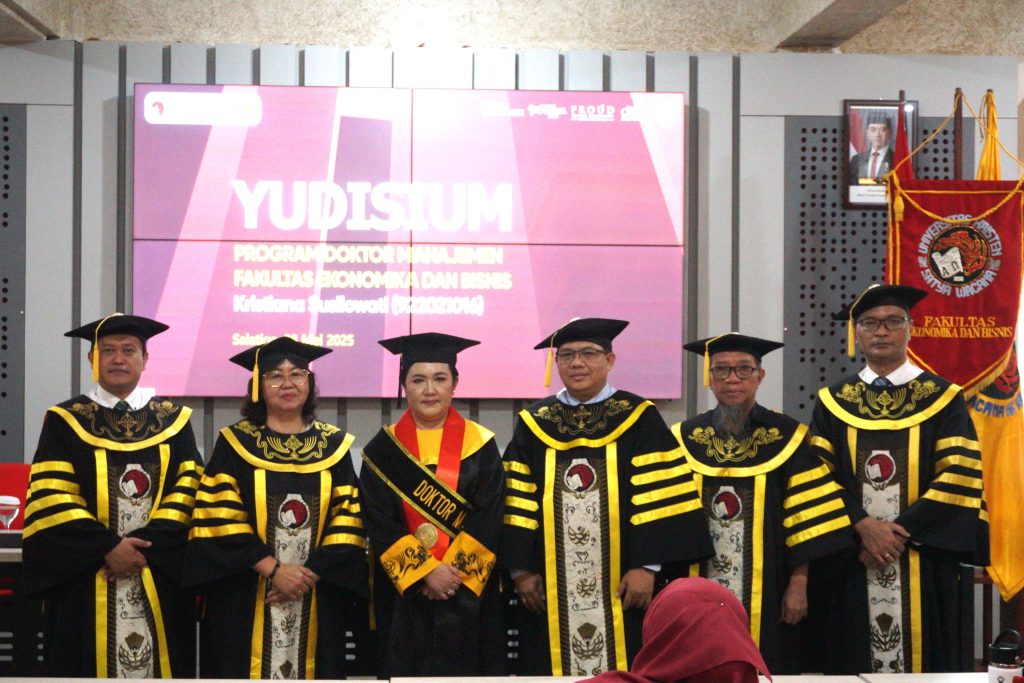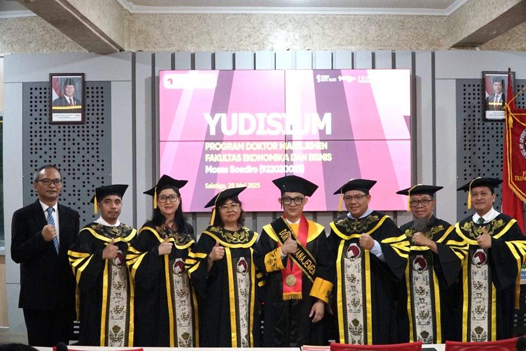 Fakultas Ekonomika dan Bisnis (FEB) Universitas Kristen Satya Wacana (UKSW) kembali mencatatkan tonggak penting dalam pengabdiannya terhadap ilmu pengetahuan. Melalui prosesi Yudisium Program Studi (Prodi) Doktor Manajemen (DM) yang berlangsung khidmat, Rabu (28/05/2025), dua akademisi resmi dikukuhkan sebagai Doktor Manajemen, yaitu Dr. Kristiana Susilowati, S.KM, SM., MM., dan Dr. Moses Soediro, S.E., M.M. Yudisium dipimpin langsung oleh Dekan FEB Dr. Yefta Andi Kus Noegroho, S.E., M.Si., Ak.