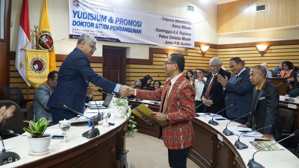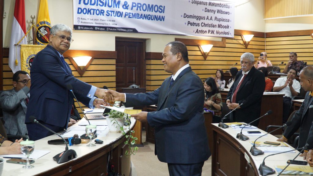 Berbangga atas pencapaian kelima promovendus, Dekan FId sekaligus Ketua Prodi DSP, Prof. Daniel D. Kameo, Ph.D., dalam sambutannya mengucapkan selamat atas kesuksesan mereka sehingga mampu menempuh proses pembelajaran dan penelitian di Prodi DSP. Ia menyampaikan bahwa tema beragam yang dibawakan dalam yudisium kali ini, menunjukan luasnya cakupan pembelajaran studi pembangunan dalam mendukung pengembangan nasional.