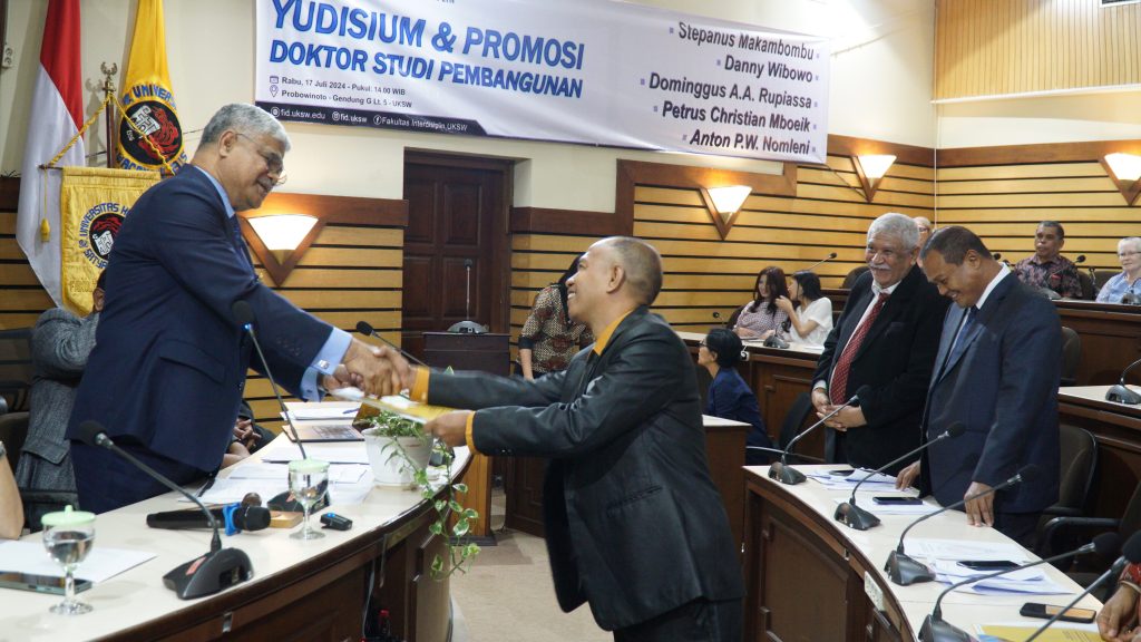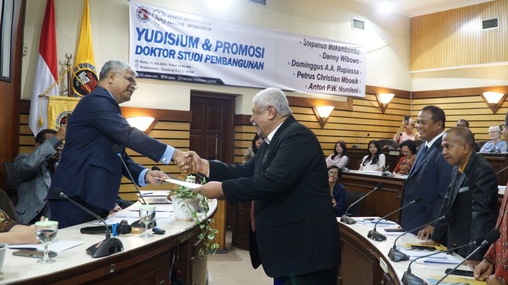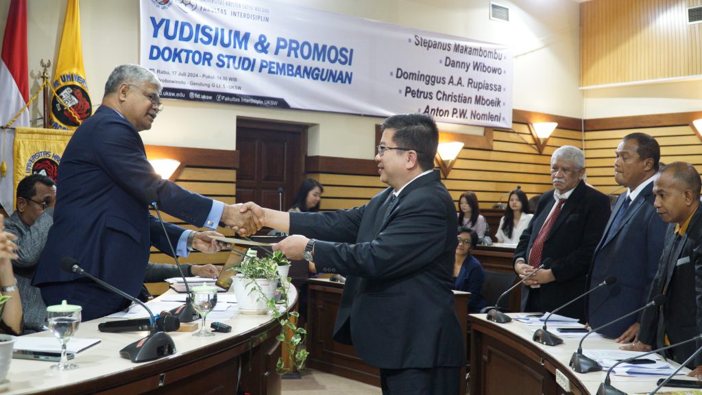 Lima mahasiswa Program Studi (Prodi) Doktor Studi Pembangunan (DSP) Fakultas Interdisiplin (FId) Universitas Kristen Satya Wacana (UKSW), dinyatakan lulus dalam gelaran Yudisium dan Promosi DSP, Rabu (17/07/2024). Berlangsung di Ruang Probowinoto Gedung G UKSW, kelulusan ini menandai bertambahnya jumlah doktor yang lulus dari Prodi DSP UKSW menjadi sebanyak 84 orang.