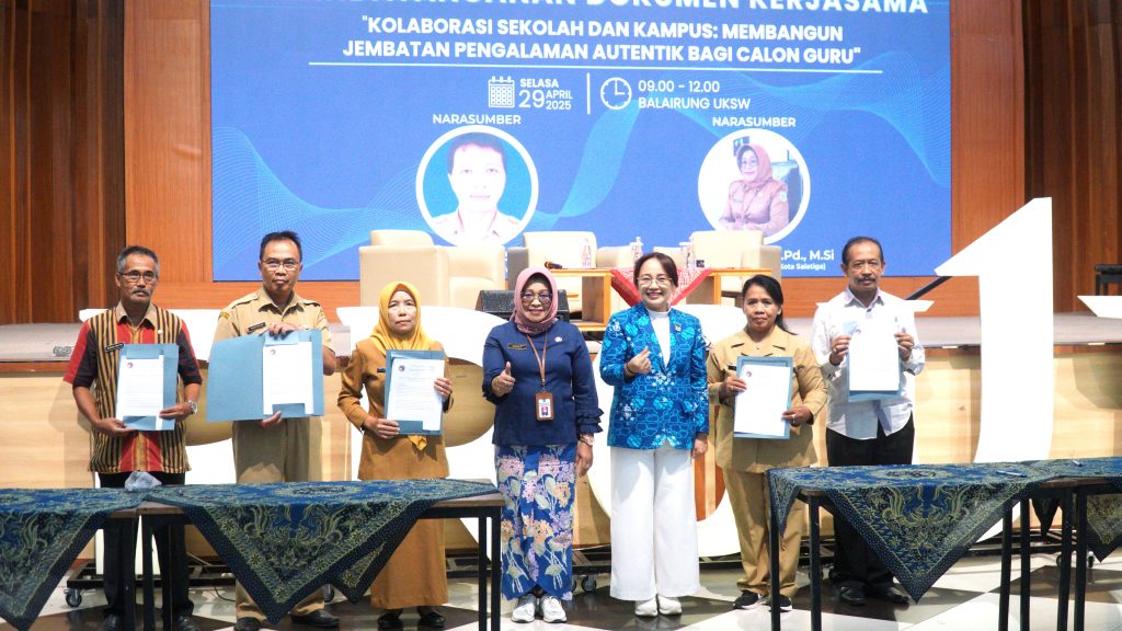 Fakultas Keguruan dan Ilmu Pendidikan (FKIP) Universitas Kristen Satya Wacana (UKSW) memperkuat kemitraan strategis dengan 28 sekolah dari Salatiga dan sekitarnya melalui penandatanganan Implementation Arrangement, Selasa (29/04/2025), di Balairung Universitas. Kegiatan ini dirangkai dengan seminar bertema “Kolaborasi Sekolah dan Kampus: Membangun Jembatan Pengalaman Autentik bagi Calon Guru.”