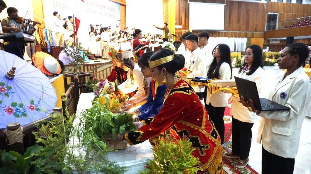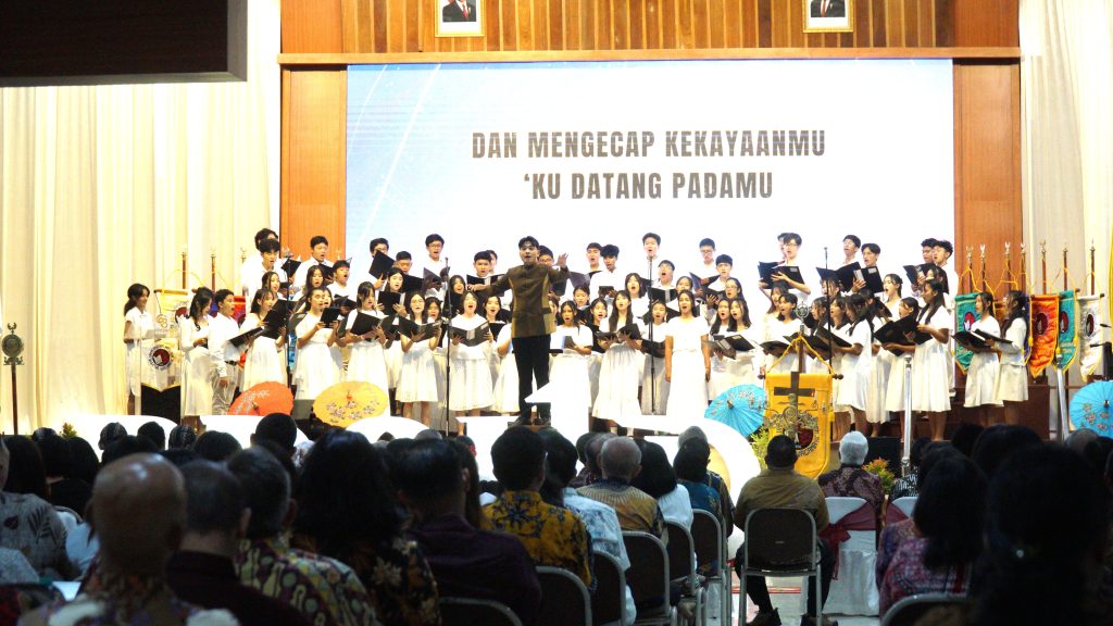 Dikemas dalam bingkai liturgis bernuansa narasi historis reflektif dengan diiringi kidung pujian, Ibadah Syukur Dies Natalis ke-68 Universitas Kristen Satya Wacana (UKSW) berlangsung khidmat, Jumat (29/11/2024) malam. Acara yang berlangsung di Balairung UKSW ini dihadiri segenap keluarga besar yang terdiri dari dosen, mahasiswa, tenaga kependidikan serta para pensiunan. Turut hadir dalam kesempatan penuh suka cita adalah Pembina, Pengurus, dan Pengawas Yayasan Perguruan Tinggi Kristen Satya Wacana (YPTKSW). Tidak ketinggalan Pimpinan Universitas, Fakultas dan juga Direktorat dan unit juga menghadiri ibadah.