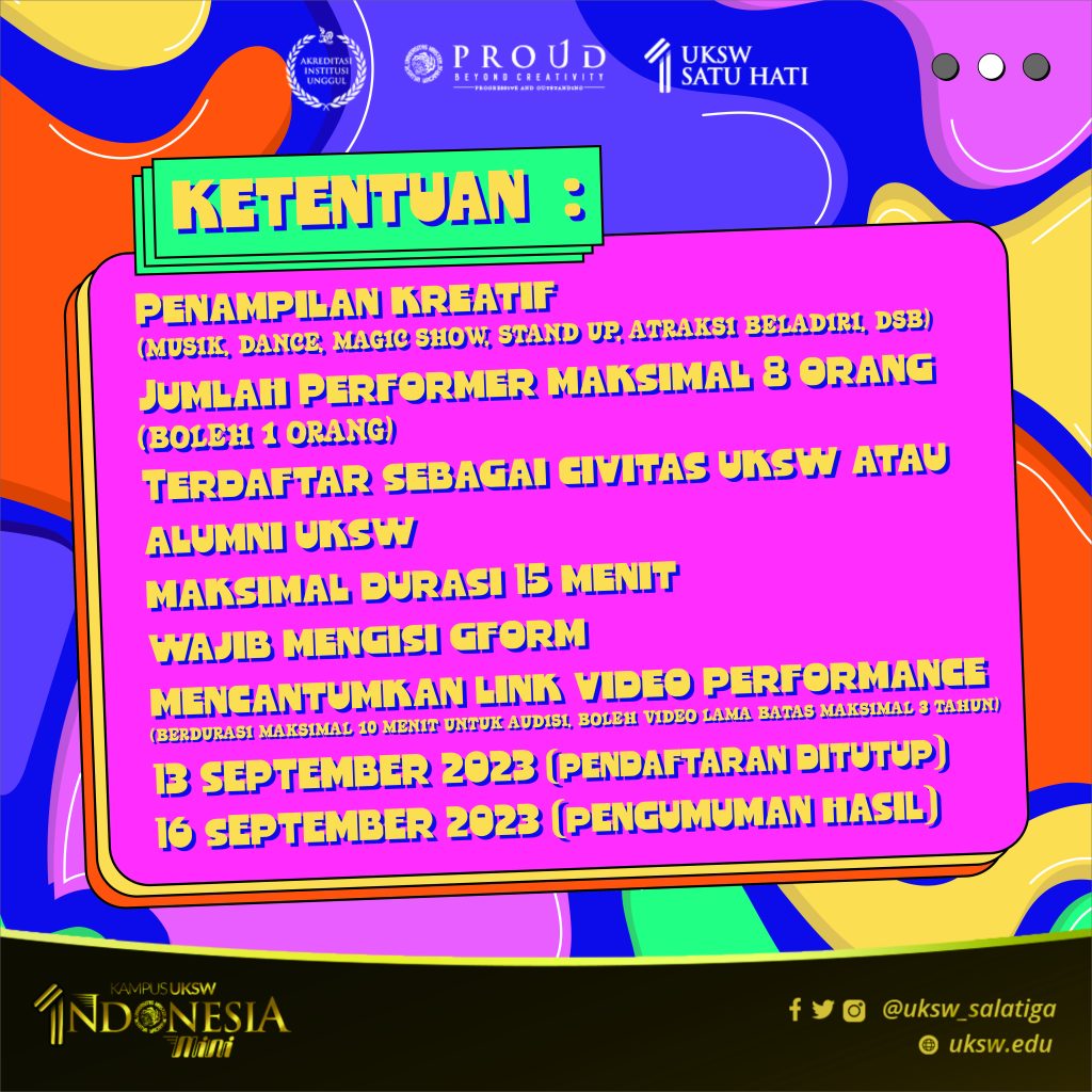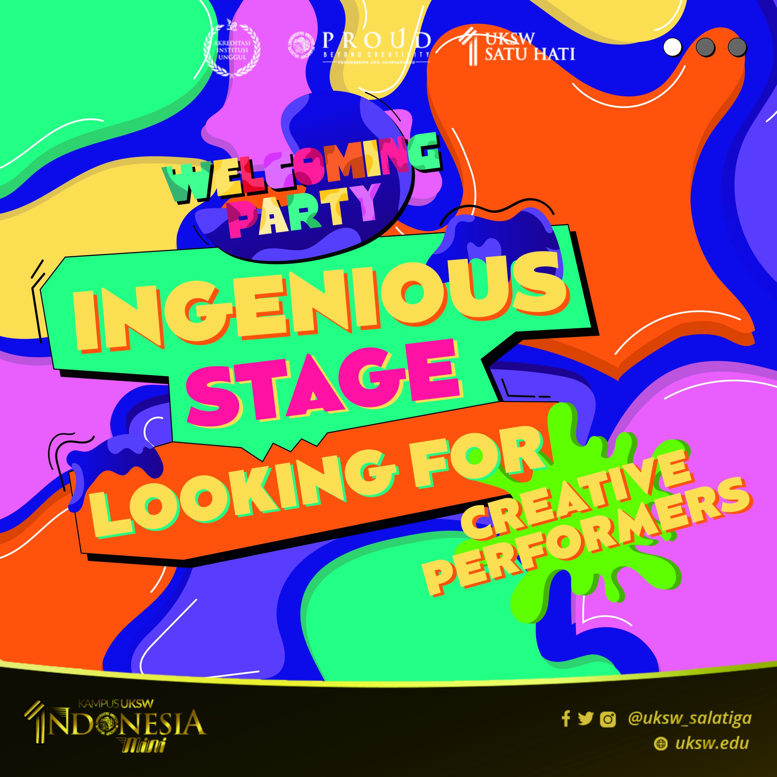 Bagi mahasiswa yang mempunyai bakat dalam bidang musik, dance, magic show, stand up, atraksi beladiri dan bakat lainnya dan berminat menjadi performer dalam acara Ingenious Stage Welcoming Party 2023, dapat melakukan pendaftaran melalui: