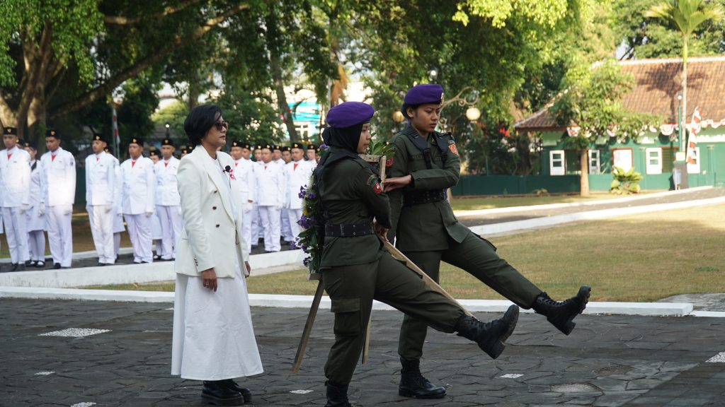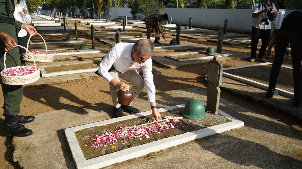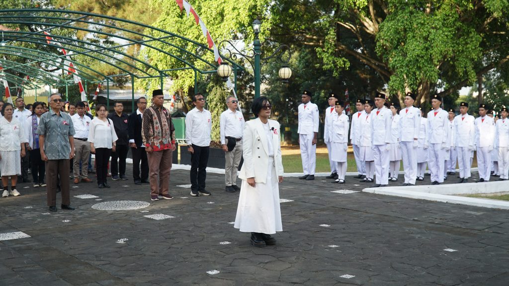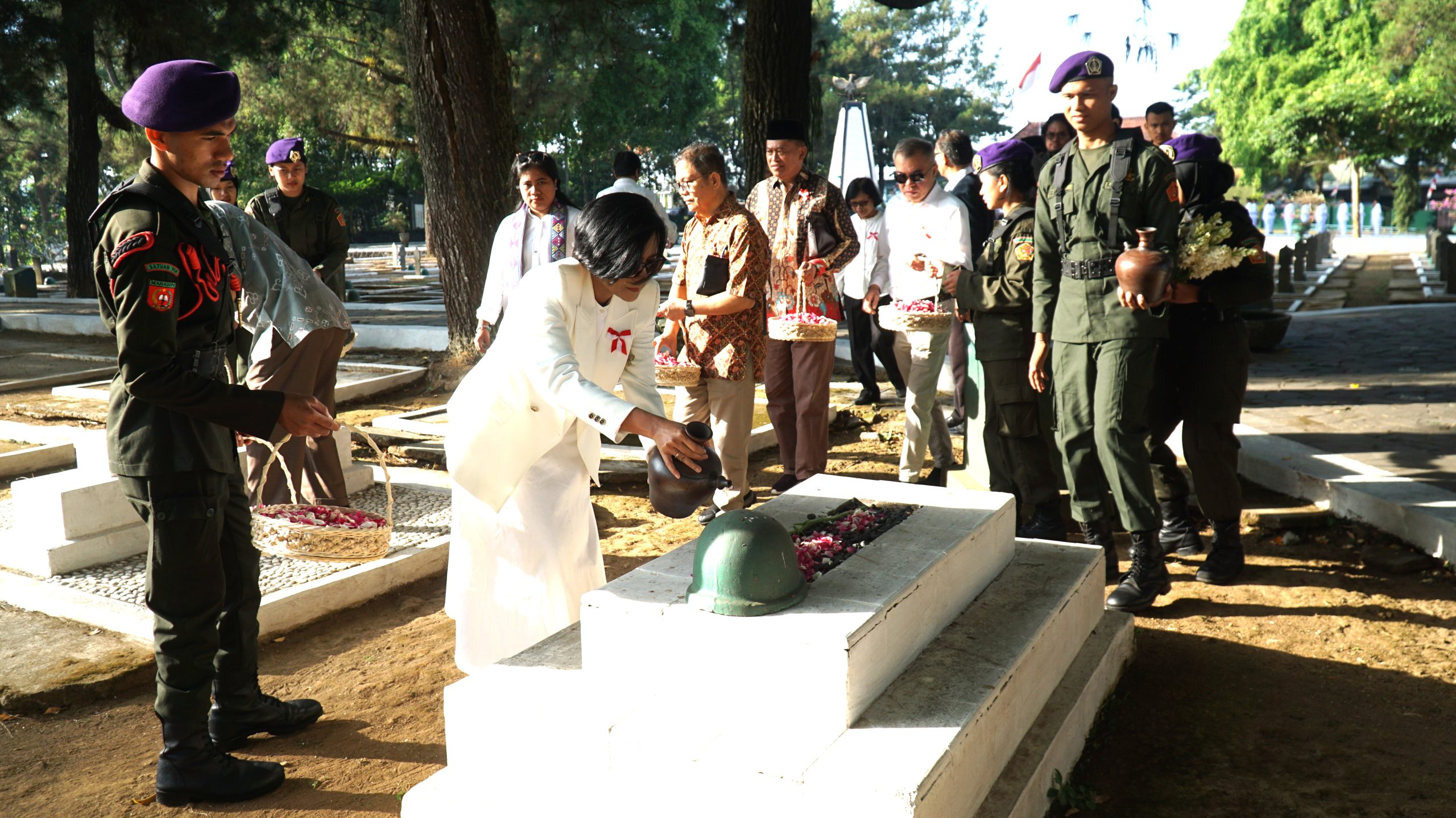 Di antara nisan-nisan yang yang menjadi saksi bisu perjuangan bangsa, berdirilah Rektor UKSW Prof. Dr. Intiyas Utami, S.E., M.Si., Ak., dalam upacara penghormatan sebagai komandan. Hadir Wakil Rektor Bidang Pengajaran, Akademik, dan Kemahasiswaan (WR PAK) Prof. Dr. Ferdy Semuel Rondonuwu, S.Pd., M.Sc., Wakil Rektor Bidang Keuangan, Infrastruktur, dan Perencanaan (WR KIP) Priyo Hari Adi, S.E., M.Si., Ph.D., Ak., yang turut mendampingi.