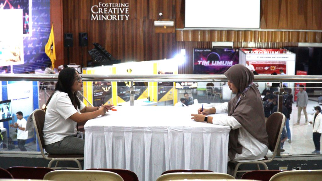 Di hari kedua Job Fair 46 UKSW Jumat (18/10/2024) di Balairung Universitas, nampak sejumlah perusahaan dan lembaga pendidikan mengadakan seleksi kerja mulai dari seleksi berkas, wawancara hingga tes tertulis. Seleksi kerja dilakukan langsung di stand setiap perusahaan serta di ruangan yang tidak jauh dari Balairung Universitas yakni gedung Fakultas Interdisiplin ruang G204 dan G505.