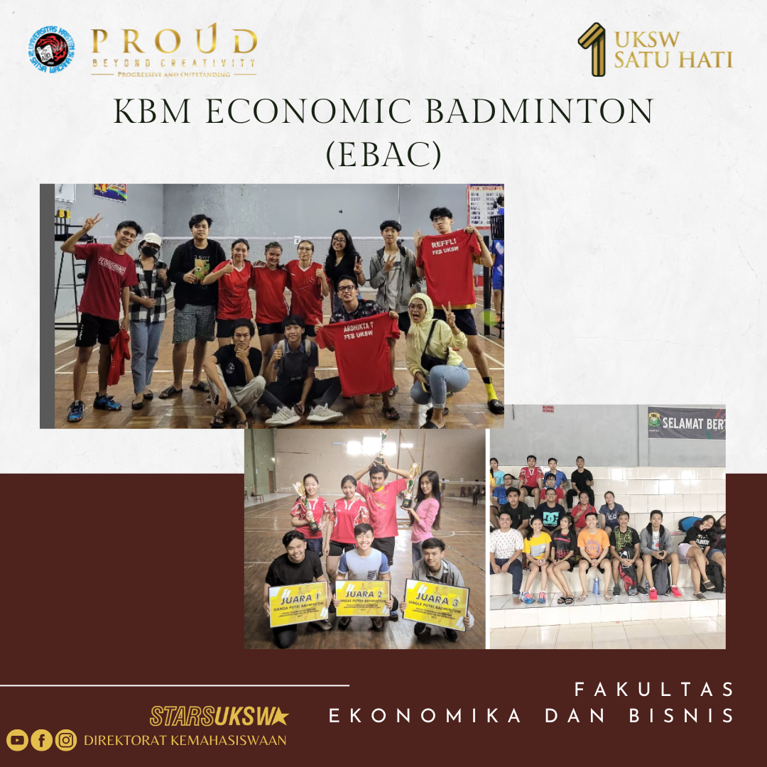 Economic Badminton Club adalah salah satu kelompok bakat minat yang beranggotakan mahasiswa-mahasiswi fakultas Ekonomika dan bisnis dalam kegiatan olahraga badminton yang menjadi wadah bagi mahasiswa yang memiliki kemampuan dan kompetensi dibidang olahraga badminton. selain itu EBAC juga menjadikan mahasiswa mahasiswi mengembangkan hardskills dan softskill mereka.
