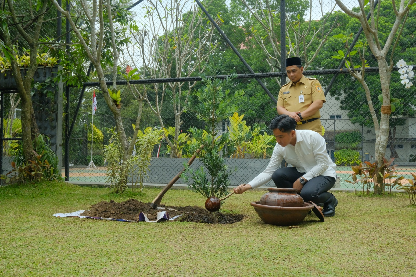 Tak hanya menjadi narasumber talkshow, Wapres Gibran Rakabuming juga berkesempatan menanam pohon di kampus hijau UKSW. Bersama Rektor UKSW Profesor Intiyas Utami, Wapres Gibran Rakabuming menanam pohon Lohansung Silver (Podocarpus Macrophyllus) di depan Lapangan Basket UKSW.