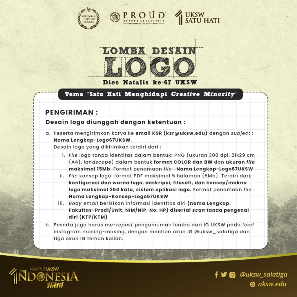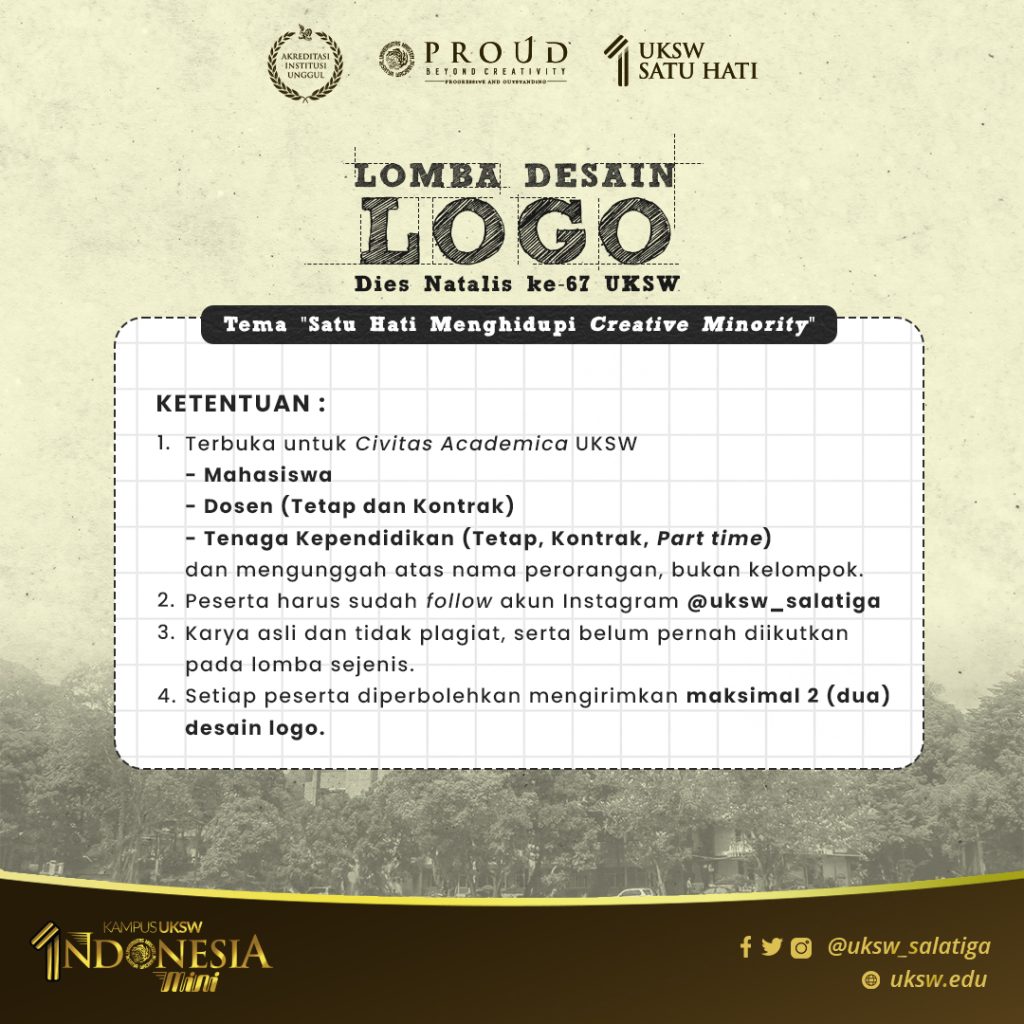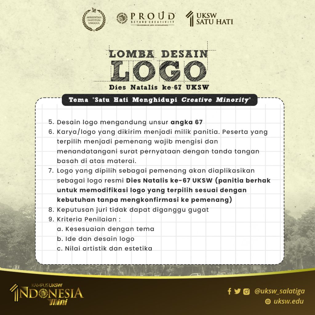 Dalam rangka menyambut Dies Natalis ke-67, Pimpinan UKSW menyelenggarakan Lomba Desain Logo Dies Natalis ke-67 UKSW dengan tema “Satu Hati Menghidupi Creative Minority”.