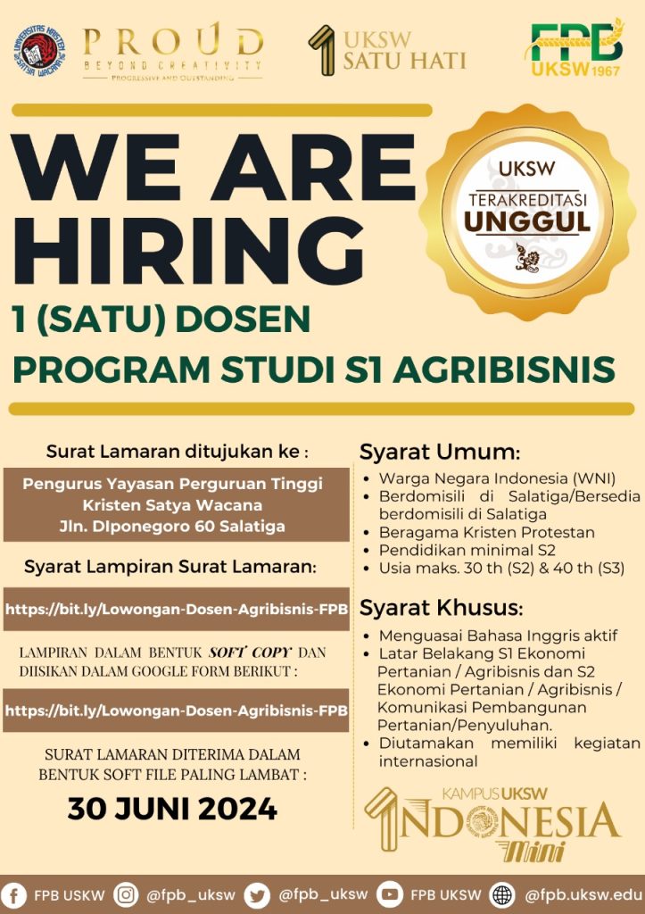 Yayasan Perguruan Tinggi Kristen Satya Wacana (YPTKSW) membuka lowongan bagi dosen Program Studi S1 Agribisnis Fakultas Pertanian dan Bisnis (FPB).