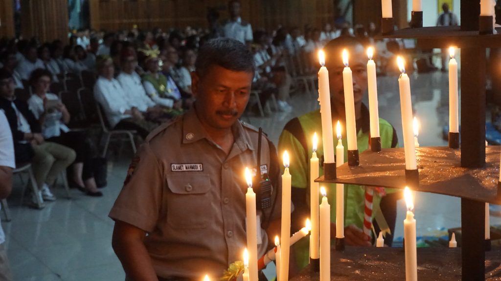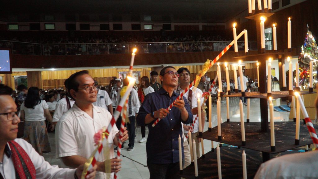 Prosesi penyalaan lilin juga mewarnai ibadah kemarin. Nampak Rektor Intiyas beserta para Wakil Rektor, Pengurus YPTKSW, perwakilan dari unsur pensiunan, dosen, tenaga kependidikan, serta mahasiswa secara bergiliran menyalakan lilin yang ditata menyerupai pohon Natal.