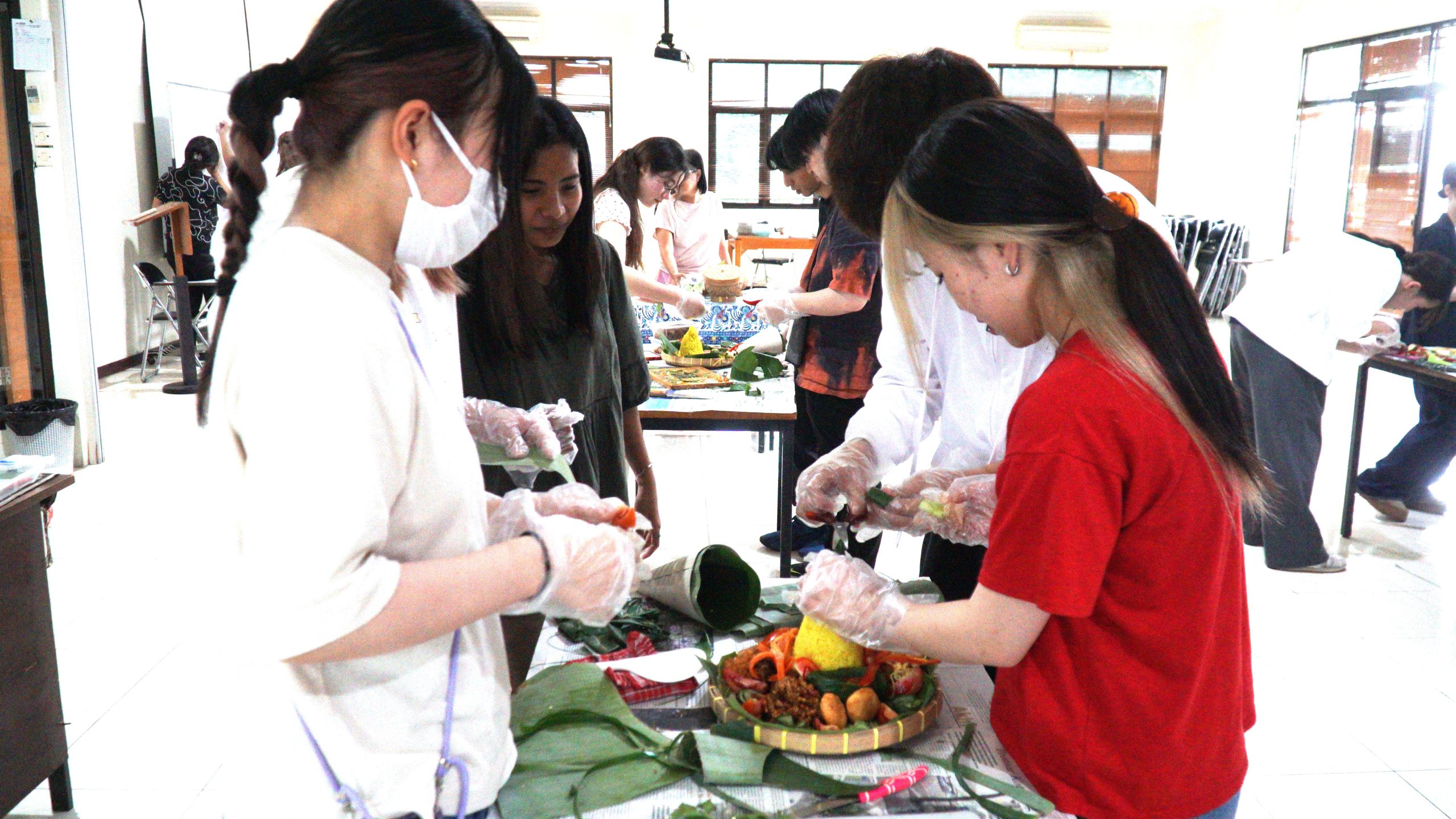 Momen pembelajaran bahasa dan budaya mahasiswa Jepang di UKSW terasa istimewa. Mereka tidak sekadar belajar bahasa Indonesia dalam ruang kelas, tetapi juga mengalami budaya secara langsung. Kali ini, bersama mahasiswa UKSW, mereka diajak membuat tumpeng, ikon kuliner khas Indonesia yang sarat akan filosofi. Dengan teliti dan penuh antusiasme, mereka menata nasi berbentuk kerucut yang melambangkan harapan serta kesejahteraan, dihiasi beragam lauk yang kaya akan rasa dan makna.