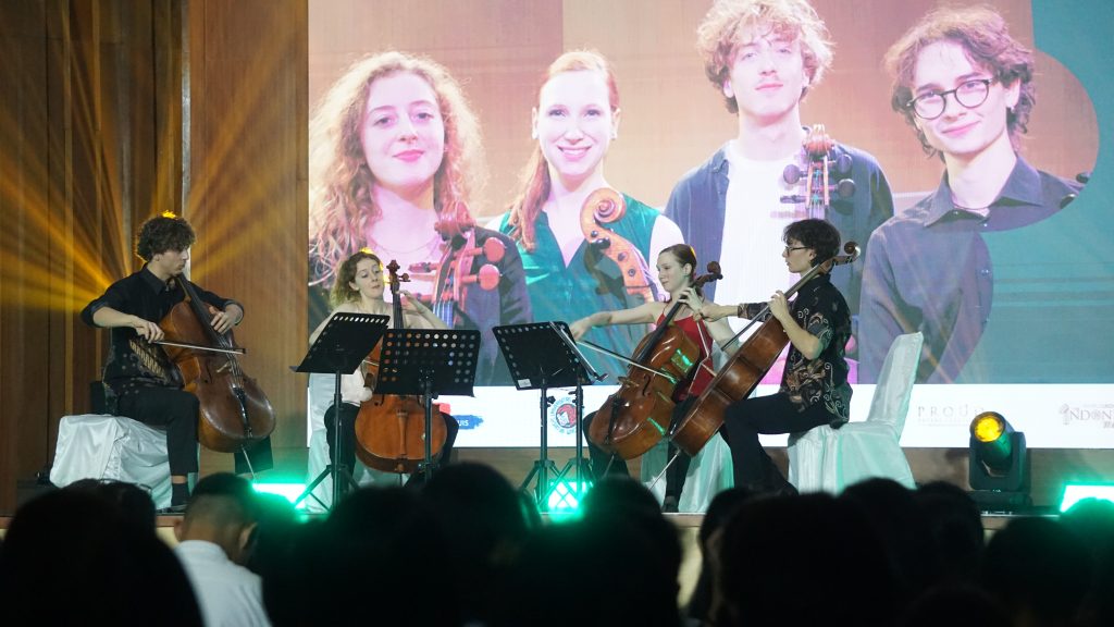 Manjakan pecinta musik klasik, suguhan Cello Concert Cello Biennale Amsterdam dihadirkan Program studi (Prodi) Seni Musik Fakultas Bahasa dan Seni (FBS) Universitas Kristen Satya Wacana (UKSW), Senin (11/12/2023) malam. Sebuah festival musik internasional yang berfokus pada keindahan alunan cello ini digelar di Balairung Universitas atas kerja sama dengan Pusat Kebudayaan Belanda Erasmus Huis.