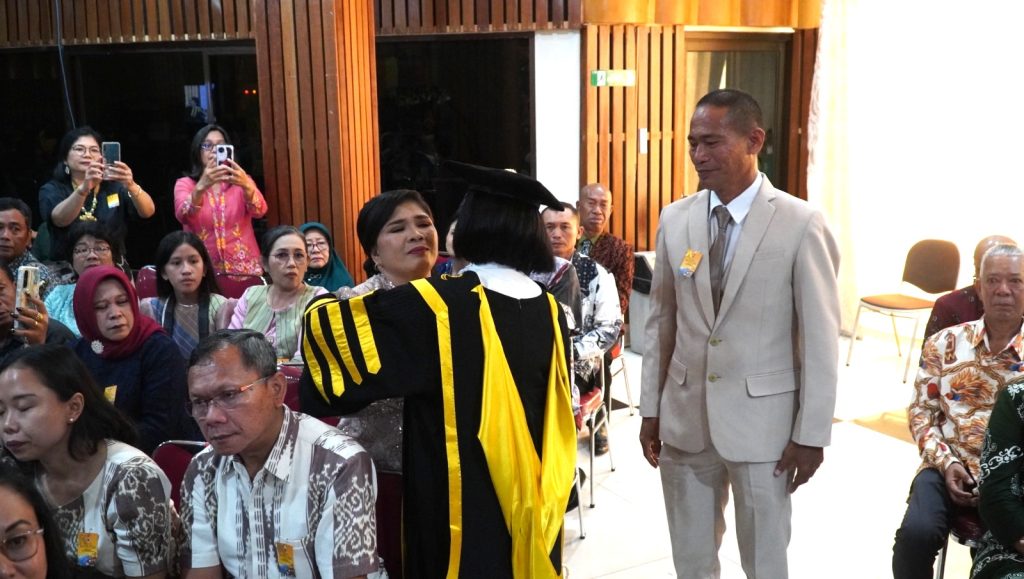 Raut wajah syukur tak bisa ia sembunyikan, setiap senyuman mencerminkan jejak doa yang dikabulkan. “Tuhan itu baik, kami sangat kagum atas keberhasilan Shinta saat ini. Kesuksesan anak adalah kebanggaan bagi orang tua. Setelah melewati badai tersebut, kami sangat bahagia bisa berkumpul kembali bersama anak-anak tercinta,” katanya. Tak lupa Jemi Tundunaung juga menyampaikan ungkapan terima kasihnya kepada UKSW karena menanamkan nilai humanis bagi mahasiswanya. “Kami mendorong anak kami berkuliah di UKSW karena meyakini bahwa Kota Salatiga dan kampus ini memiliki nilai humanis yang tinggi hingga saat ini dapat menyaksikan Shintia menyelesaikan studinya dengan baik,” imbuhnya.
