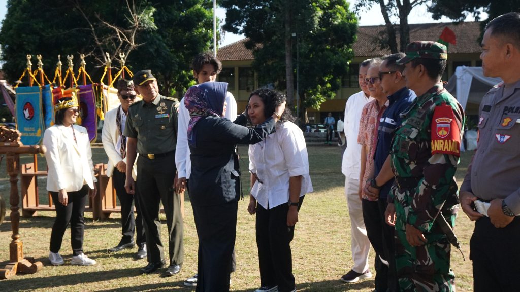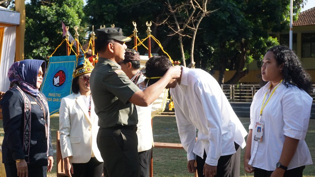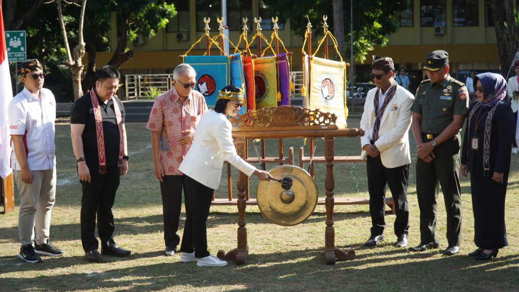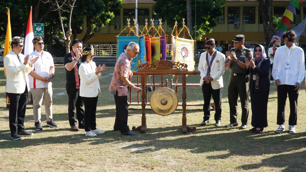 Sebagai tanda dimulainya kegiatan OMB 2024, Nunuk Dartini, S.Pd., M.Si., dan Pasi Bin Puanter Korem 073/Makutarama Kota Salatiga Mayor Inf Muhlisin melakukan pengalungan tanda peserta OMB dan dilanjutkan dengan pemukulan gong oleh Rektor Intiyas dan Drs. M.Z. Ichsanudin, M.M.