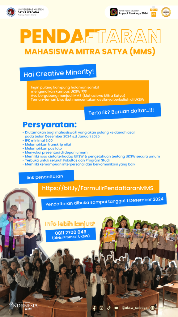 Divisi Promosi dan Komunikasi Publik (DivProm Komblik) UKSW membuka pendaftaran Mahasiswa Mitra Satya bagi mahasiswa UKSW yang akan pulang ke daerah asal dan tertarik untuk mengenalkan UKSW ke teman-teman di daerahnya. Narahubung: 0811 2700 049 (Divisi Promosi UKSW). (Mail/Ish)