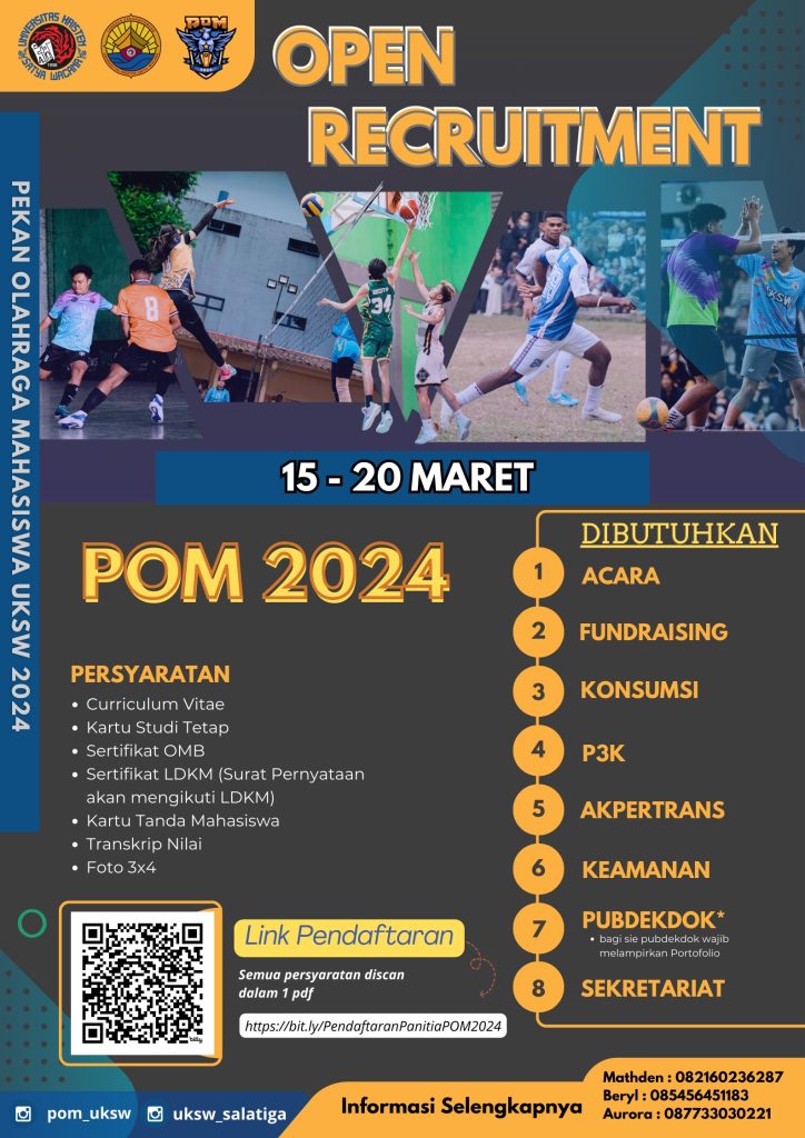 Pendaftaran panitia Pekan Olahraga Mahasiswa (POM) 2024 telah dibuka. Bagi mahasiswa aktif UKSW yang berminat dapat mendaftarkan diri dengan ketentuan sebagai berikut: