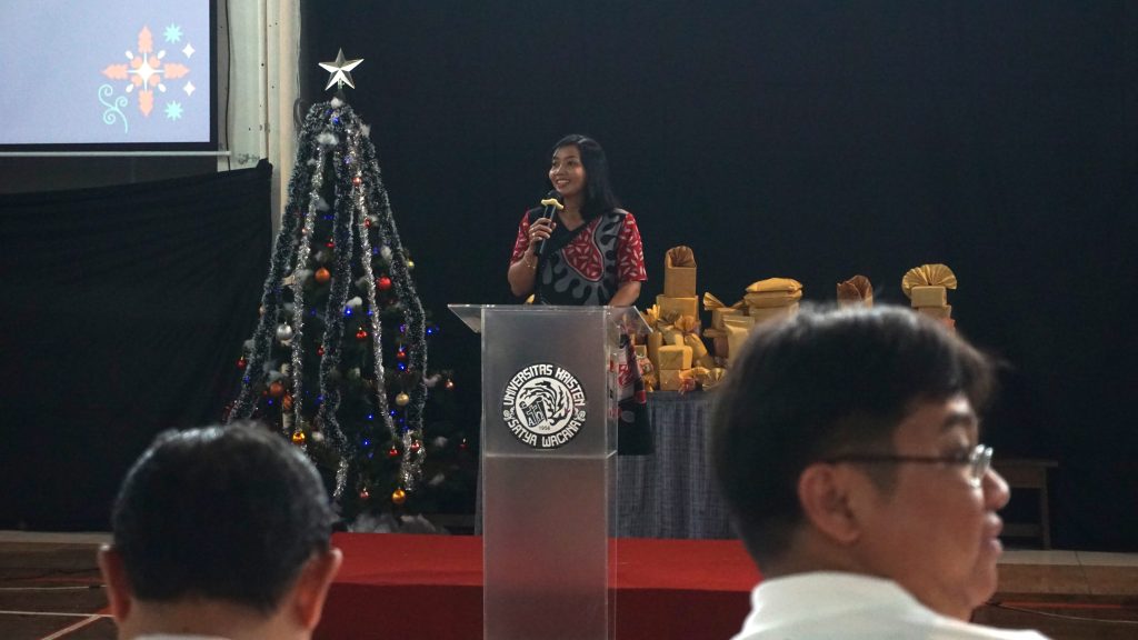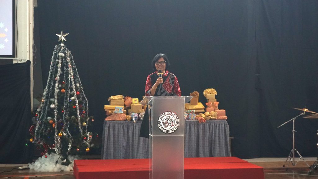 Sedangkan Direktur Sekolah Kristen Satya Wacana (Sekolah Laboratorium) Dra. Emy Wuryani, M.Hum., dalam sambutannya menyampaikan terima kasih untuk seluruh dukungan yang telah diberikan bagi sekolah. Ia berharap agar semangat Natal kali ini dapat memperkuat pula semangat keterlibatan aktif civitas academica untuk mendukung Sekolah Kristen Satya Wacana yang kian berprestasi dan transformatif, menjadi tujuan pendidikan berkualitas.