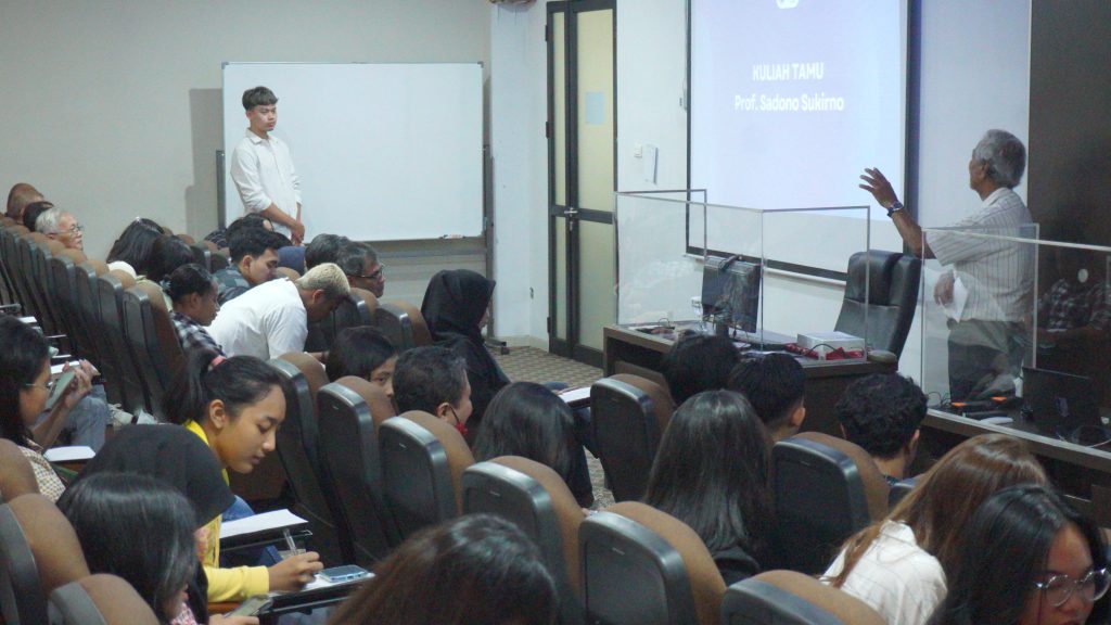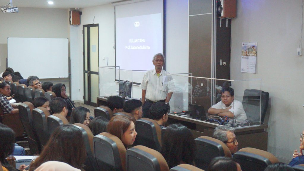 Untuk kedua kalinya, kuliah tamu Prodi IE menghadirkan pakar ekonomi pembangunan Prof. Sadono Sukirno seorang Emiritus Profesor dari University of Malaya sebagai narasumber tunggal. Mengawali paparannya, Prof. Sadono Sukirno mengajukan pertanyaan kepada para peserta mengenai konsep dan analisis yang digunakan dalam ilmu ekonomi. “Kita perlu memahami terlebih dahulu konsep makroekonomi sebagai bagian dari analisa ekonomi,” ungkapnya.