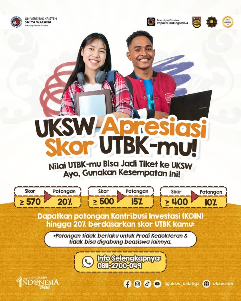 UKSW membuka pintu lebar-lebar bagi calon mahasiswa yang memiliki skor Ujian Tulis Berbasis Komputer (UTBK) melalui program apresiasi skor UTBK. Tak hanya sekadar pengakuan, skor UTBK-mu bisa menjadi tiket masuk ke Kampus Indonesia Mini ini dengan potongan kontribusi (KOIN) hingga 20%.