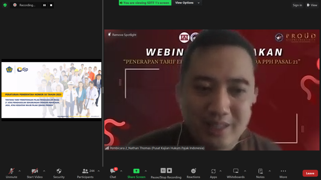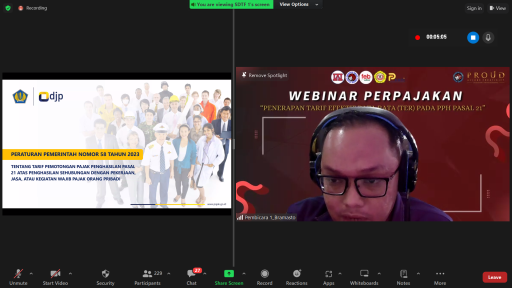 Bramasto Aditomo memaparkan tentang Peraturan Pemerintah Nomor 58 tahun 2023 tentang Tarif Pemotongan PPh Pasal 21 atas penghasilan yang berhubungan dengan pekerjaan, jasa, atau kegiatan wajib pajak orang pribadi.