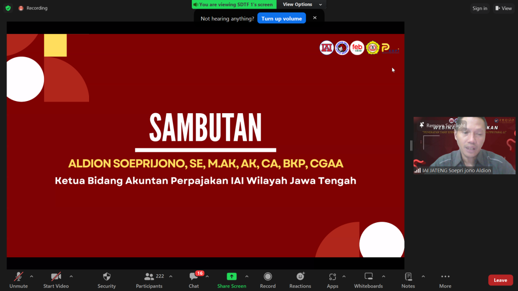 Pada kesempatan ini, Ketua Bidang Akuntan Perpajakan IAI Wilayah Jawa Tengah Aldion Soeprijono, S.E., M.AK., AK., CA., BKP., CGAA., menyampaikan ucapan terima kasih sekaligus harapannya untuk keberlanjutan webinar perpajakan dan akuntansi yang bersinergi ini.