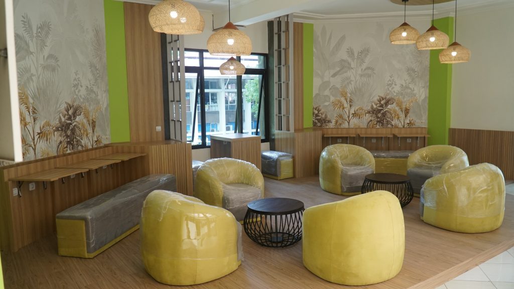 Adapun lampu gantung dengan rajutan rotan yang dirancang memberi penerangan lembut menciptakan suasana tenang. Sementara jendela besar yang menghadap taman memberikan pemandangan hijau segar dengan sentuhan ornamen tumbuhan di dinding, menambah kesan kesejukan bagi setiap pengunjung.