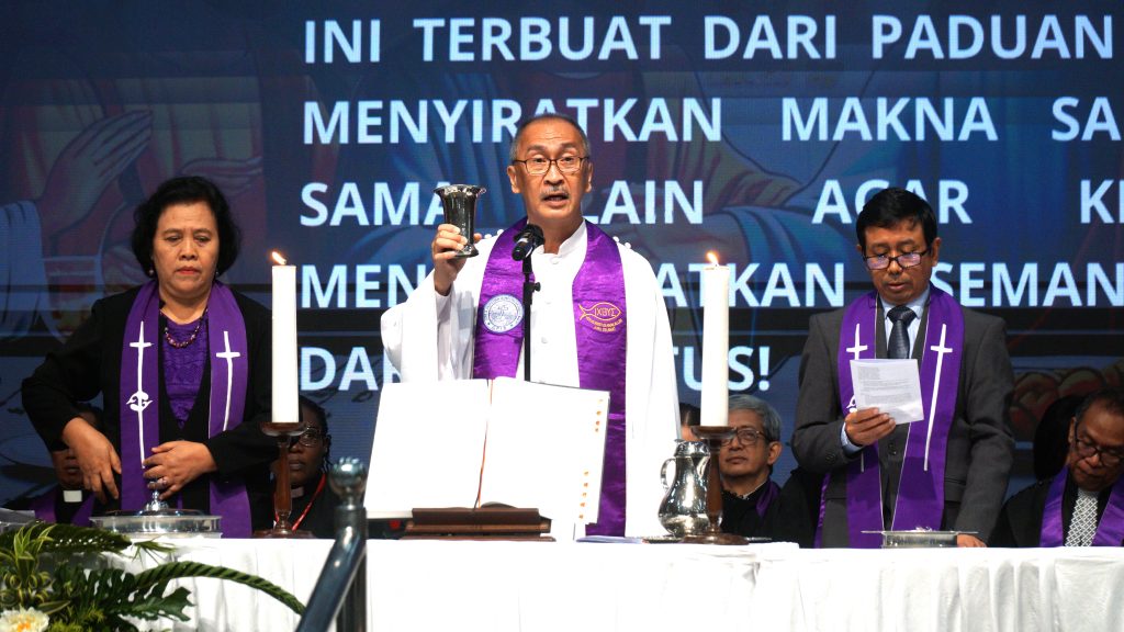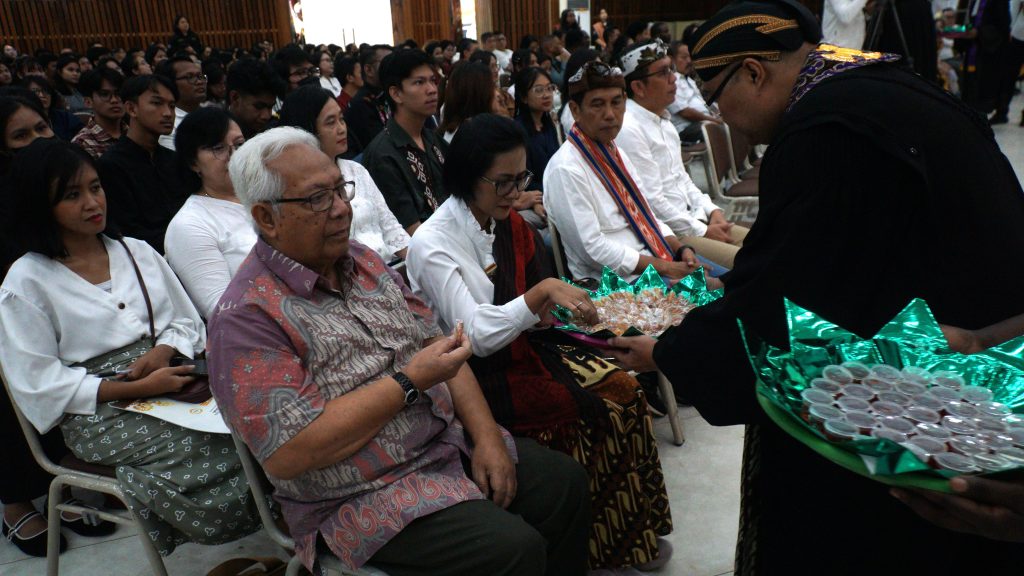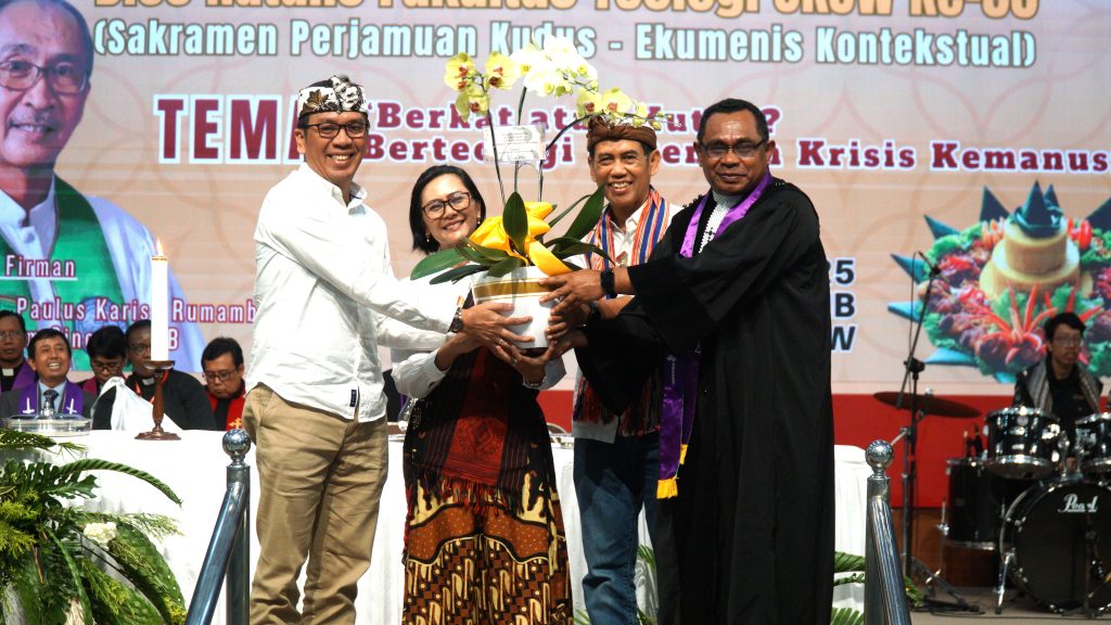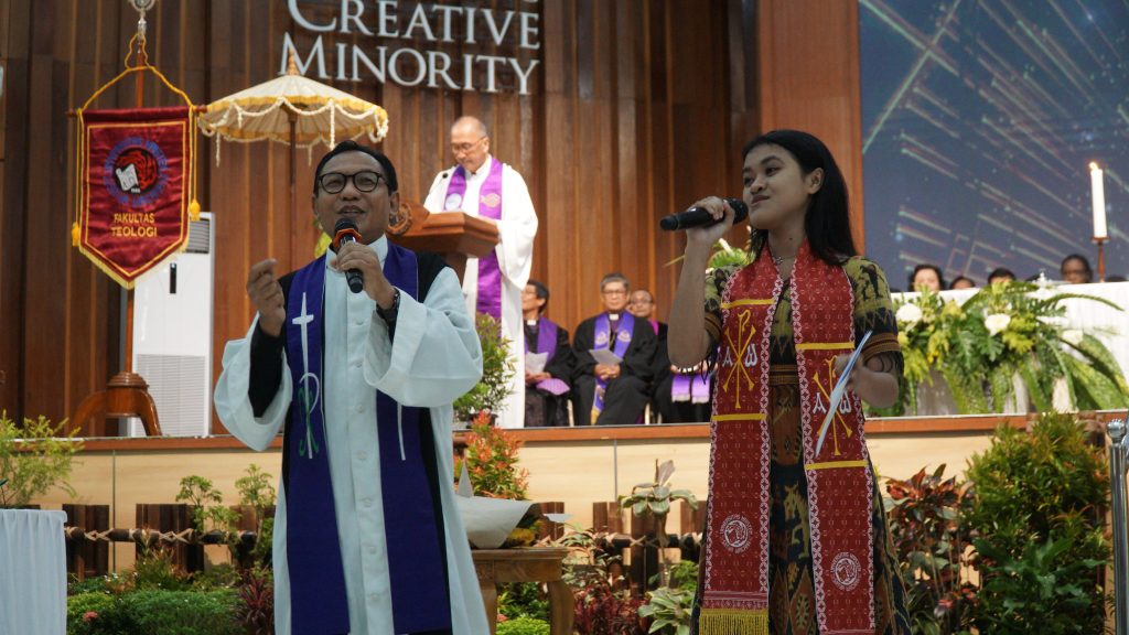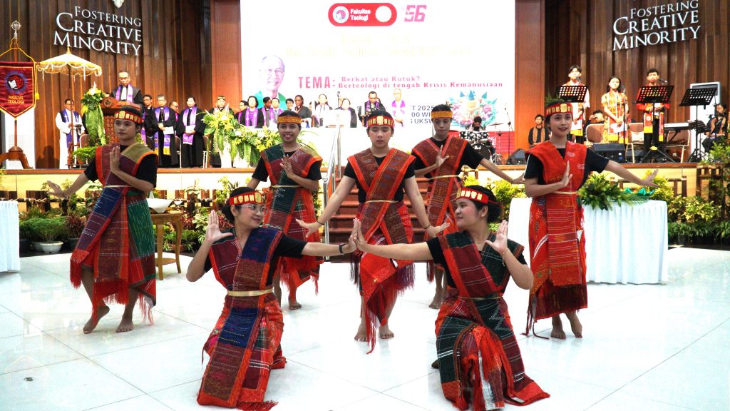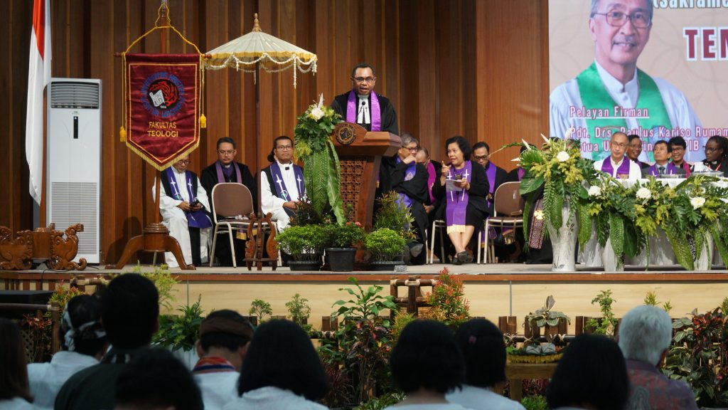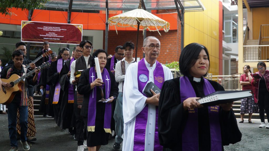 Fakultas Teologi Universitas Kristen Satya Wacana (UKSW) merayakan Dies Natalis ke-56 dengan ibadah syukur yang sarat makna di Balairung Universitas, Senin (10/03/2025). Ibadah ekumenis kontekstual ini mengusung tema “Berkat atau Kutuk? Berteologi di Tengah Krisis Kemanusiaan” serta diwarnai Sakramen Perjamuan Kudus dengan budaya Nusantara. Wingko babat dan secang menjadi simbol perjamuan yang berakar pada kearifan lokal.