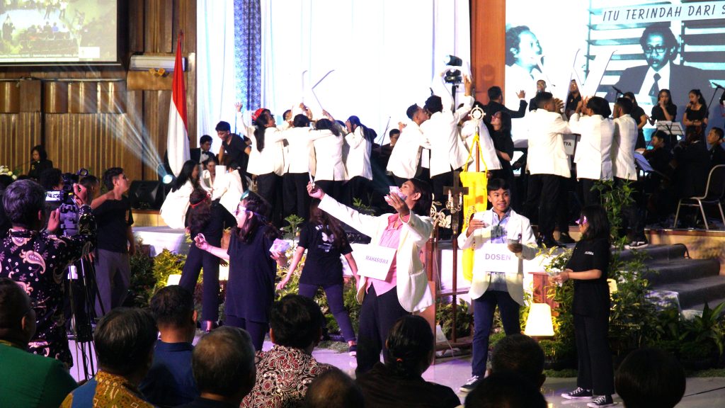 Perayaan Ibadah Dies Natalis tahun ini mengusung tema “Satu Hati Menghidupi Creative Minority” dengan dasar Firman Tuhan dari kitab Yeremia 32:39 dan Matius 5:13-16. Lebih lanjut, Ibadah Dies Natalis turut dibuka oleh Pdt. Merry Kristina Rungkat, M.Si sebagai liturgos dan penampilan Tari Lilin dari Sekolah Dasar (SD) Kristen Satya Wacana.