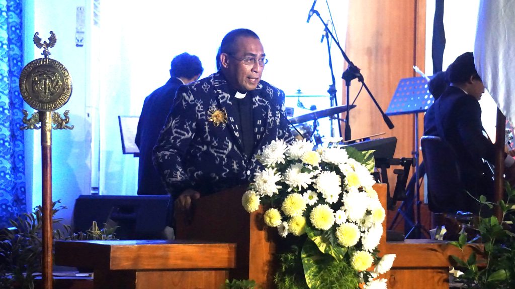 Penyampaian Firman Tuhan dalam Ibadah Dies Natalis tahun ini dibawakan oleh Sekretaris Umum Persekutuan Gereja-Gereja di Indonesia (PGI) Pdt. Dr. (H.C.) Jacklevyn Fritz Manuputty, S.Th., S.Fil., M.A.