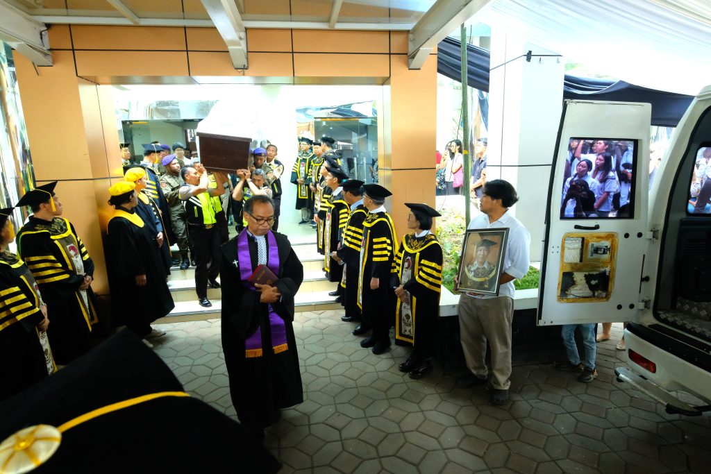 Dalam suasana khidmat, perwakilan keluarga Bagus Yuni Cahyono, menyerahkan jenazah almarhum kepada pihak universitas, menyampaikan terima kasih atas penghormatan dan kasih yang diberikan kepada mendiang selama hidupnya di UKSW.