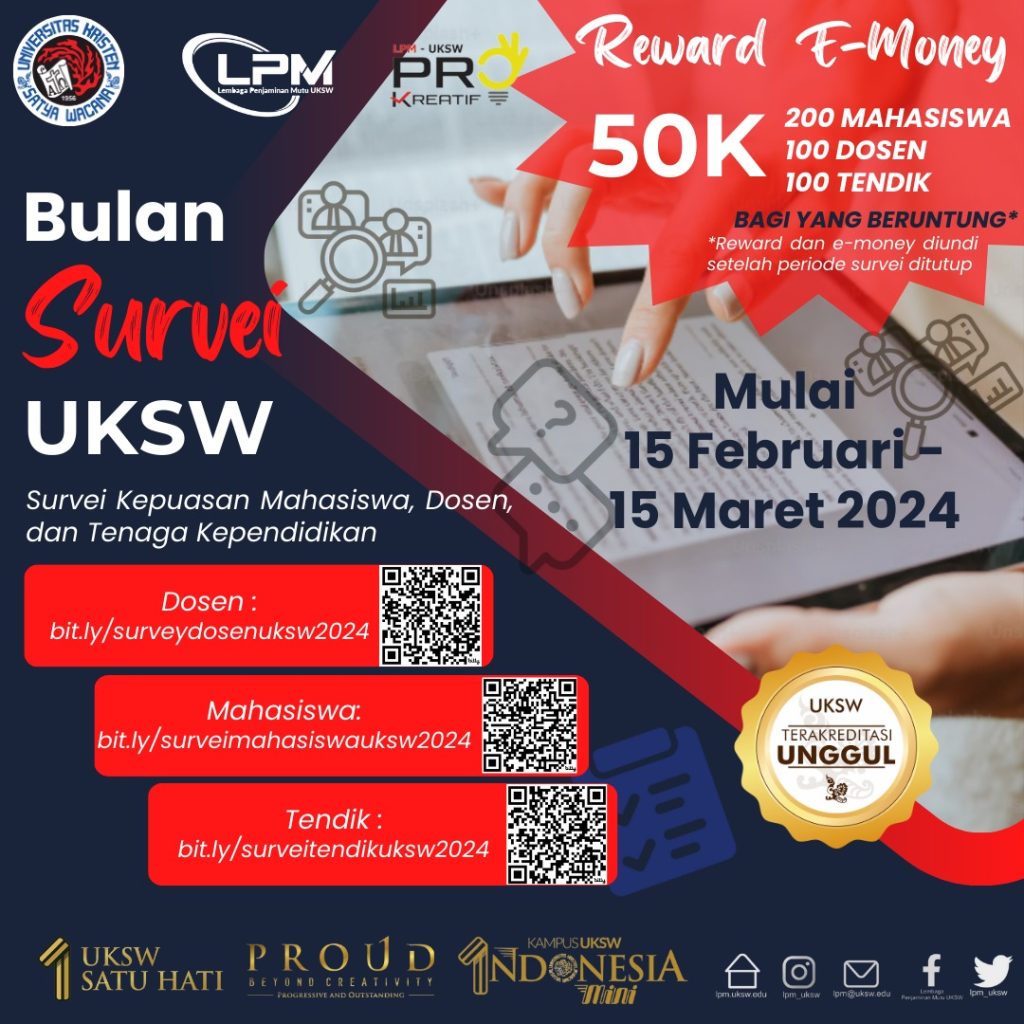 Dalam rangka peningkatan mutu lembaga serta pemenuhan data akreditasi program studi dan institusi, maka LPM UKSW menyelenggarakan Bulan Survei UKSW 2024. Bagi seluruh Mahasiswa, Dosen dan Tenaga Kependidikan untuk dapat berperan dalam peningkatan mutu lembaga melalui pengisian survei ini.
