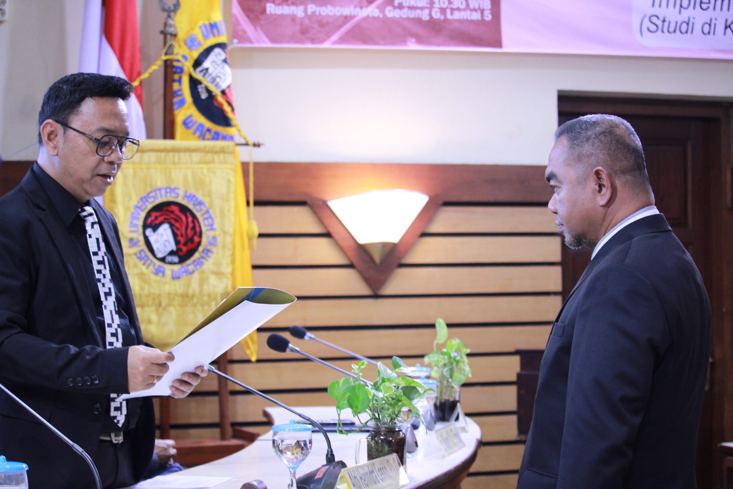 Suasana Ruang Probowinoto UKSW terasa khidmat saat prosesi sidang dipimpin oleh Dekan Fakultas Interdisiplin (FId), Dr. Aldi Herindra Lasso, S.Pd., M.M.Par., Ph.D., dengan jajaran promotor dan penguji yang terdiri atas Profesor Dr. Gatot Sasongko, S.E., M.S., sebagai Promotor, Profesor Daniel Daud Kameo, S.E., M.A., Ph.D., sebagai Kopromotor sekaligus Ketua Program Studi (Kaprodi) DSP, Profesor Dr. Umbu Rauta, S.H., M.Hum., Dr. Wilson M.A. Therik, S.E., M.Si., Dr. Jeferson Kameo, S.H., L.L.M., sebagai penguji, serta Profesor Dr. Ngabiyanto, M.Si., dari Universitas Negeri Semarang (UNNES) sebagai penguji luar.