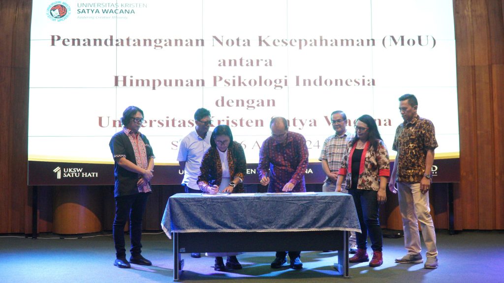 Fakultas Psikologi Universitas Kristen Satya Wacana (UKSW) dan Himpunan Psikologi Indonesia (HIMPSI) bersepakat menjalin kerja sama. Kesepakatan dicapai dengan penandatangan Memorandum of Understanding (MoU) dan Perjanjian Kerja Sama (PKS) yang berlangsung di ruang Auditorium Ds. S. Djojodihardjo, Fakultas Teknologi Informasi UKSW, Jumat (26/04/2024).