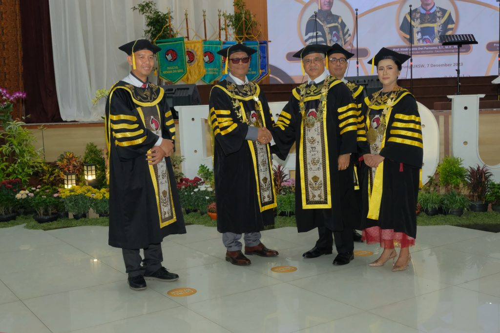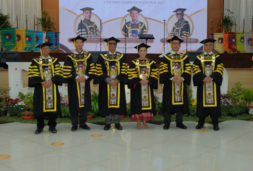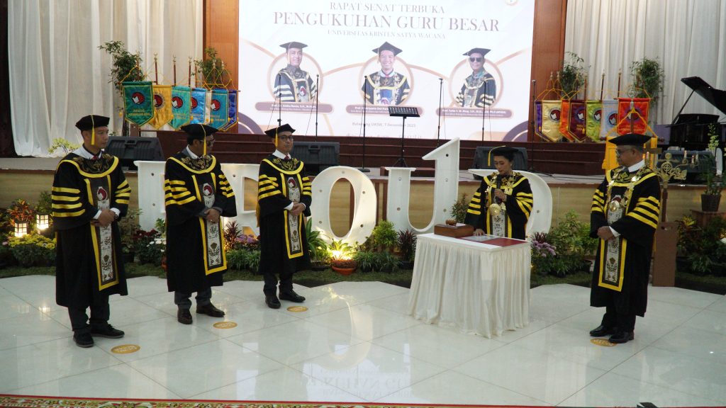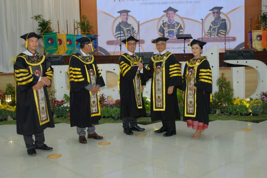 Tiga Guru Besar dikukuhkan oleh Rektor Universitas Kristen Satya Wacana (UKSW) Prof. Dr. Intiyas Utami, S.E., M.Si., Ak., Kamis (7/12/2023). Pengukuhan ditandai dengan pembacaan Surat Keputusan oleh Rektor Intiyas dan dilanjutkan dengan penyematan kalung senator oleh Ketua Senat UKSW Prof. Daniel Daud Kameo, S.E., M.A., Ph.D.