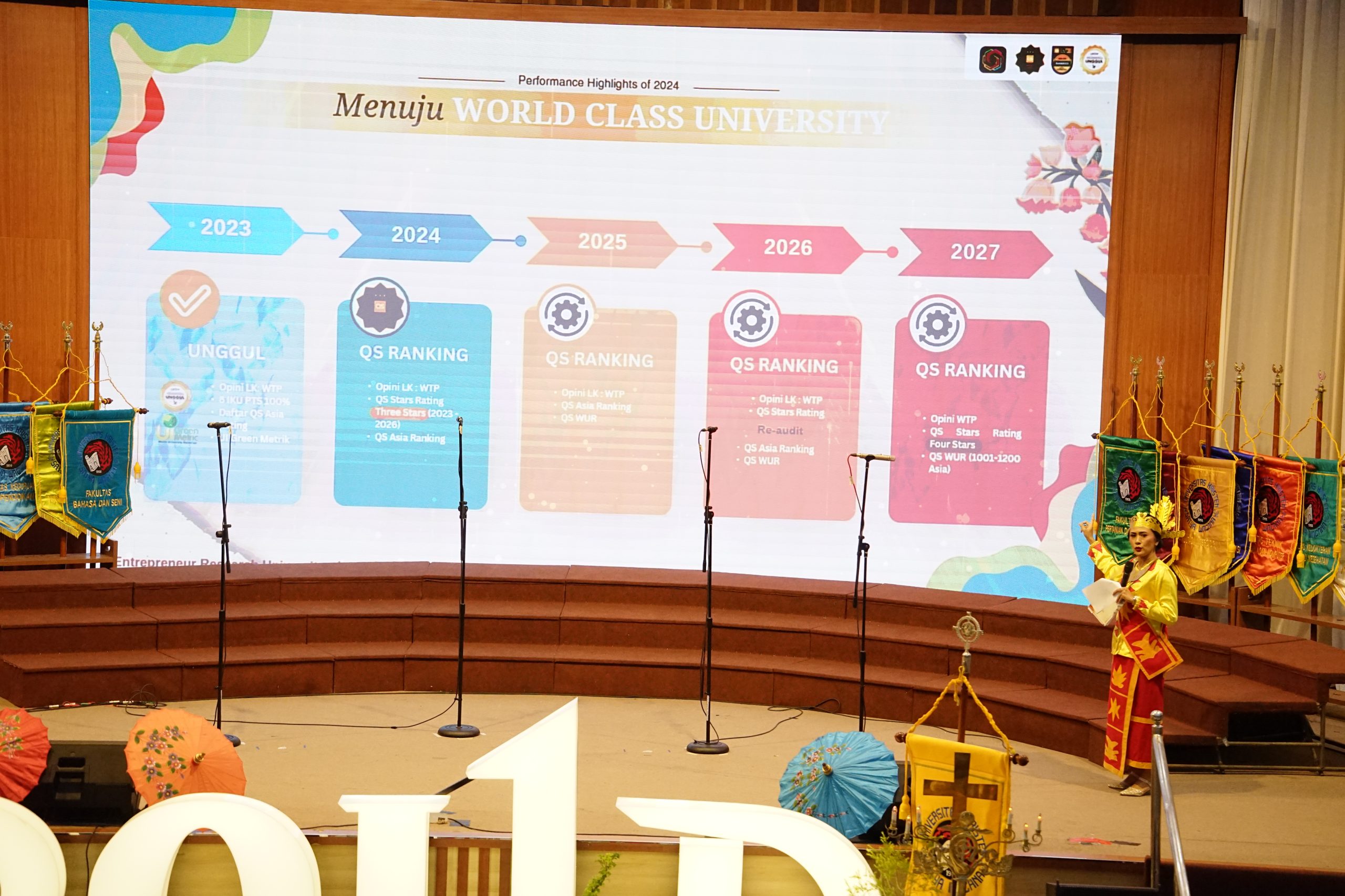 Dalam momen bersejarah ini, Rektor UKSW Prof. Intiyas Utami dengan penuh syukur dan bangga menyampaikan prestasi yang telah diraih selama satu tahun terakhir. Sejalan dengan implementasi program strategis PROUD (Progressive and Outstanding) yang dilandasi oleh enam pilar utama yang disingkat GRACEFUL yaitu Governance, Recognition, Augmented, Ecology, entrepreneur, dan Financial Sustainability.