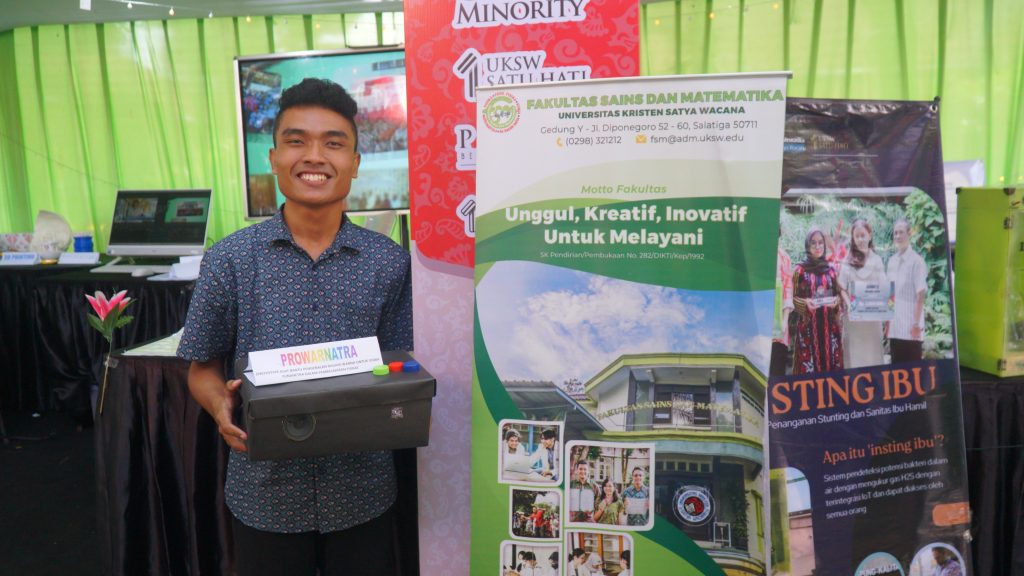 Di sisi lain, terdapat produk inovasi yang tak kalah memikat yakni “proWarNaTra: Prototype Alat Bantu Pengenalan Ragam Warna untuk Siswa Tunanetra dalam Pembelajaran Fisika” di stan Fakultas Sains dan Matematika (FSM). Produk yang dibuat oleh mahasiswa Prodi Pendidikan Fisika Fredriko Alberto Noya beserta dosen pembimbing Dr. Wahyu Hari Kristiyanto, S.Pd., M.Pd., dan Dr. Made Rai Suci Shanti Nurani Ayub, S.Si., M.P., ini berbasis media pembelajaran bagi peserta didik tunanetra.