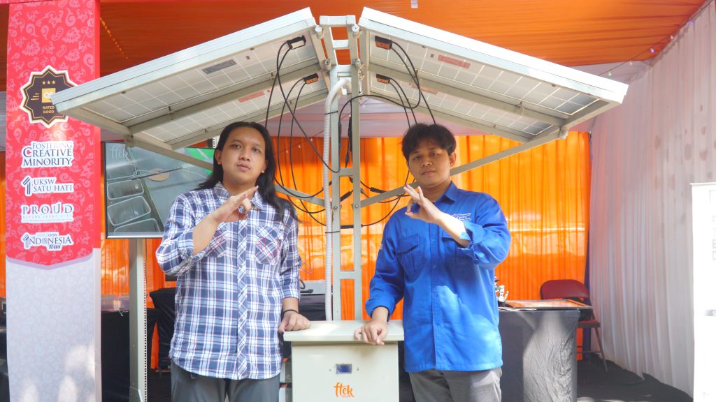 Tampak di salah satu sudut pameran, stan milik Fakultas Teknik dan Elektronika (FTEK) menarik perhatian pengunjung dengan produknya yang berbasis pemanfaatan energi surya untuk pengisi daya motor listrik. Produk yang dikenal dengan sebutan “Ecoride Sunstation” ini dirancang dengan konsep portable charging station untuk kendaraan khususnya motor listrik menggunakan off-grid solar system.