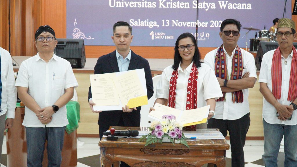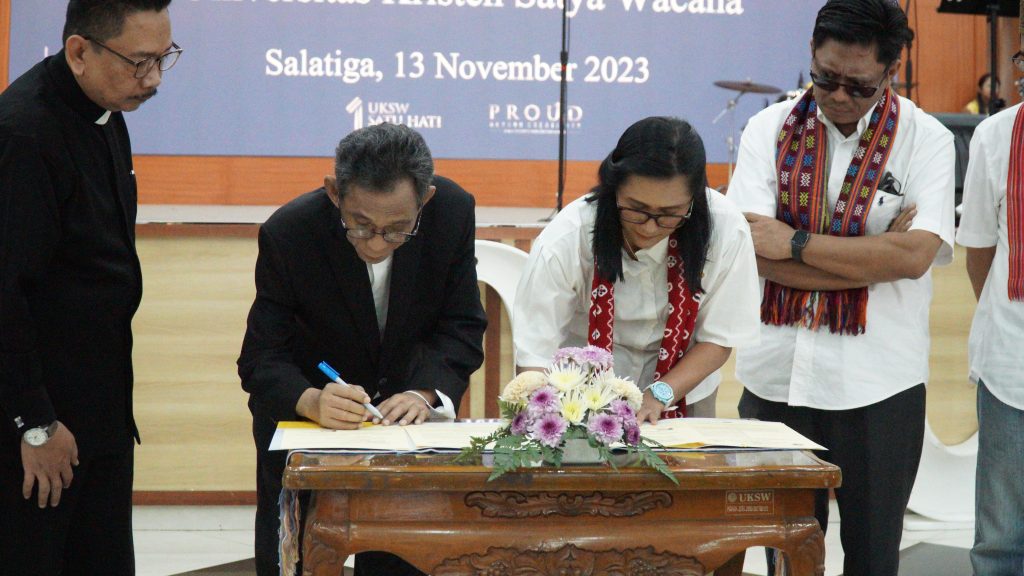 Universitas Kristen Satya Wacana (UKSW) menandatangani dua Nota Kesepahaman sekaligus, Senin (13/11/2023) di Balairung Universitas. Nota Kesepahaman dilakukan antara UKSW dengan Sinode Gereja Kristen Oikoumene (GKO) di Indonesia dan Yayasan Bantuan Kasih Indonesia (Compassion Indonesia Foundation).