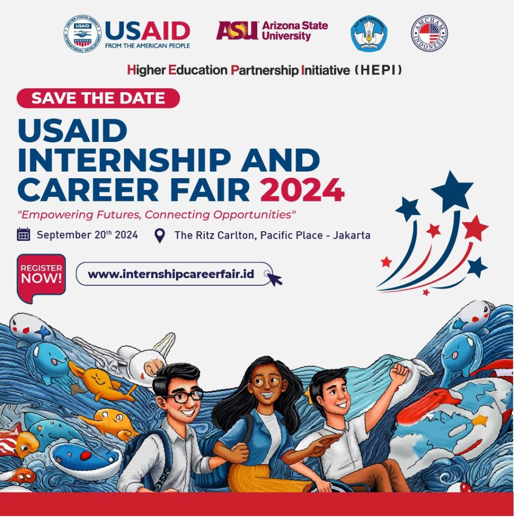 USAID, bekerja sama dengan Arizona State University (ASU) dan AmCham Indonesia, mengundang para pemuda berbakat dan profesional untuk hadir dalam USAID Internship and Career Fair 2024 pada 20 September 2024 di The Ritz-Carlton, Pacific Place, Jakarta.