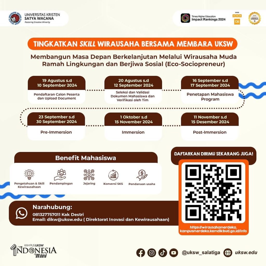 UKSW menjadi kampus penyelenggara Wirausaha Merdeka “Membangun Masa Depan Berkelanjutan Melalui Wirausaha Muda Ramah Lingkungan dan Berjiwa Sosial (Eco-Sociopreneur). Pendaftaran bagi mahasiswa UKSW untuk mengikuti program dapat dilakukan hingga 10 September 2024 melalui link https://wirausahamerdeka.kampusmerdeka.kemdikbud.go.id/info/ (Mail/Ish)