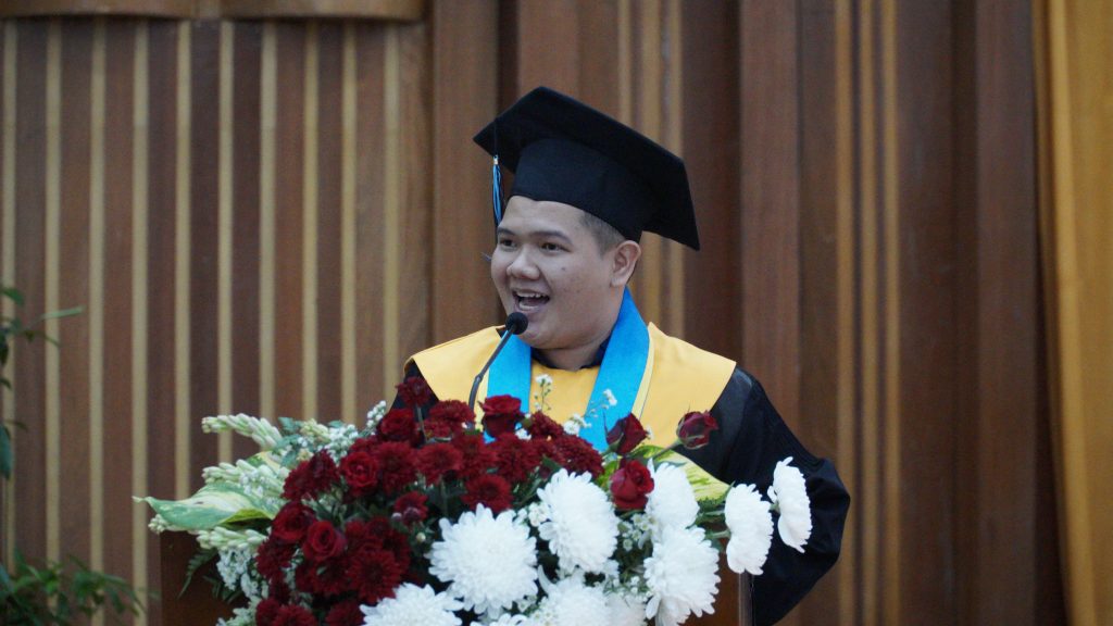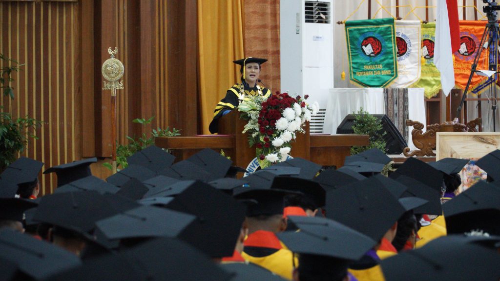Sementara itu, Perwakilan Wisudawan Allessandro Yosafat Massie, mengungkapkan rasa syukurnya kepada seluruh pihak yang telah mendukung proses belajarnya. “Jangan pernah menyerah pada keadaan. Jangan takut pada kegagalan. Sekalipun hati dan tulang-tulangmu remuk seperti sedang dipatahkan. Bangkitlah dan raih kemenangan,” kata peraih IPT dari Program Studi Pendidikan Pancasila dan Kewarganegaraan (PPKn) Fakultas Keguruan dan Ilmu Pendidikan (FKIP) tersebut.