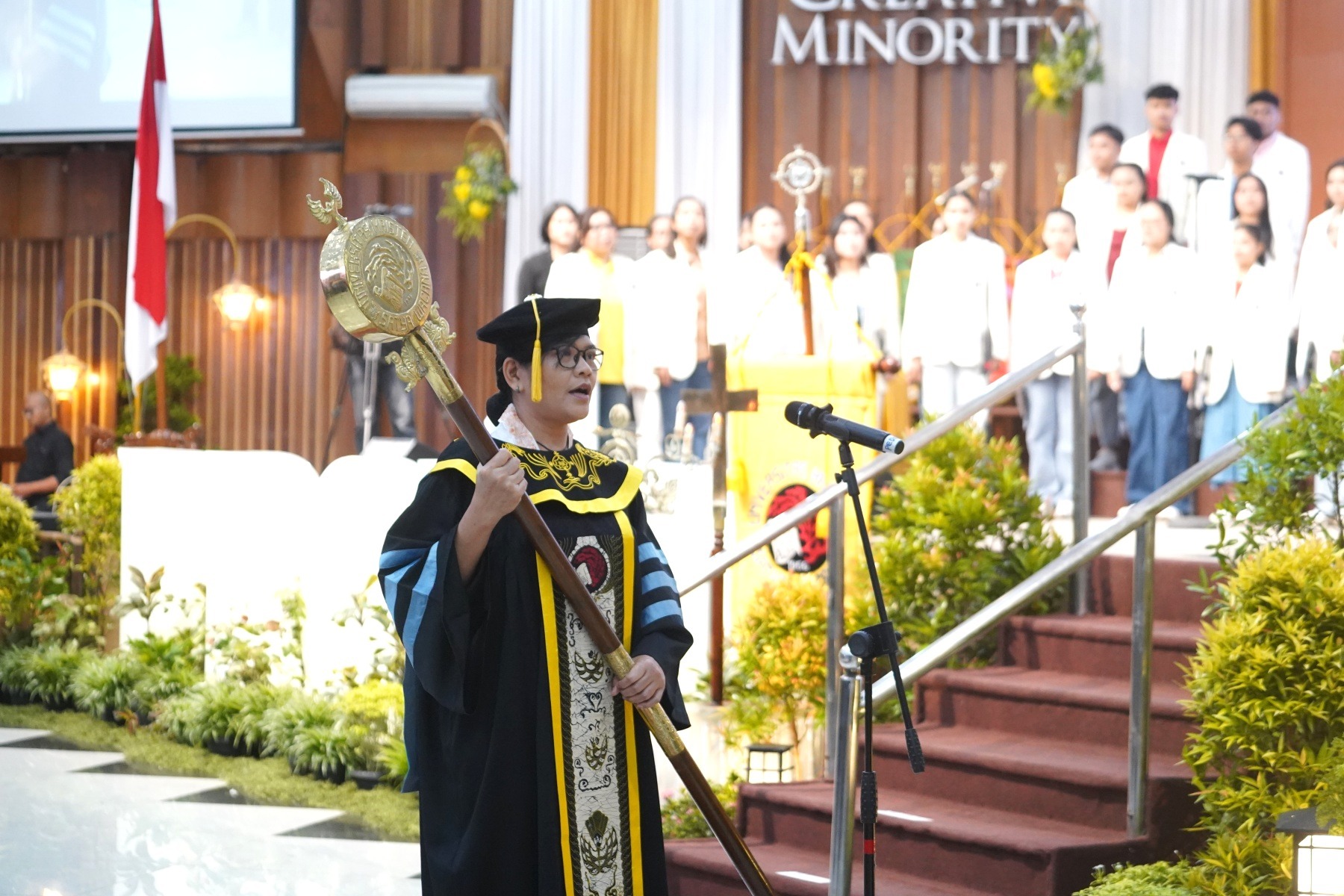 Nuansa penghormatan kepada perempuan juga tampak saat para dekan perempuan UKSW menyerahkan bunga kepada para lulusan dan orang tua sebagai simbol apresiasi dan kasih. Mereka adalah Dekan Fakultas Ilmu Sosial dan Ilmu Komunikasi (FISKOM) Dr. Ir. Sri Suwartiningsih, M.Si., Dekan Fakultas Hukum Profesor Dr. Christina Maya Indah S., S.H., M.Hum., Dekan Fakultas Keguruan dan Ilmu Pendidikan (FKIP) Dr. Helti Lygia Mampouw, M.Si., serta Dekan Fakultas Psikologi Dr. Sri Aryanti Kristianingsih, M.Si., M.H., Psikolog. Momen ini menjadi gambaran hangat tentang peran perempuan yang hadir sebagai pemimpin sekaligus penguat generasi penerus.