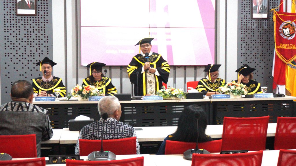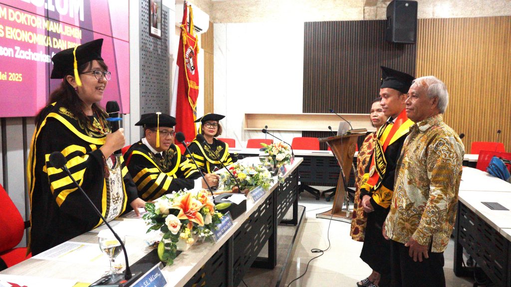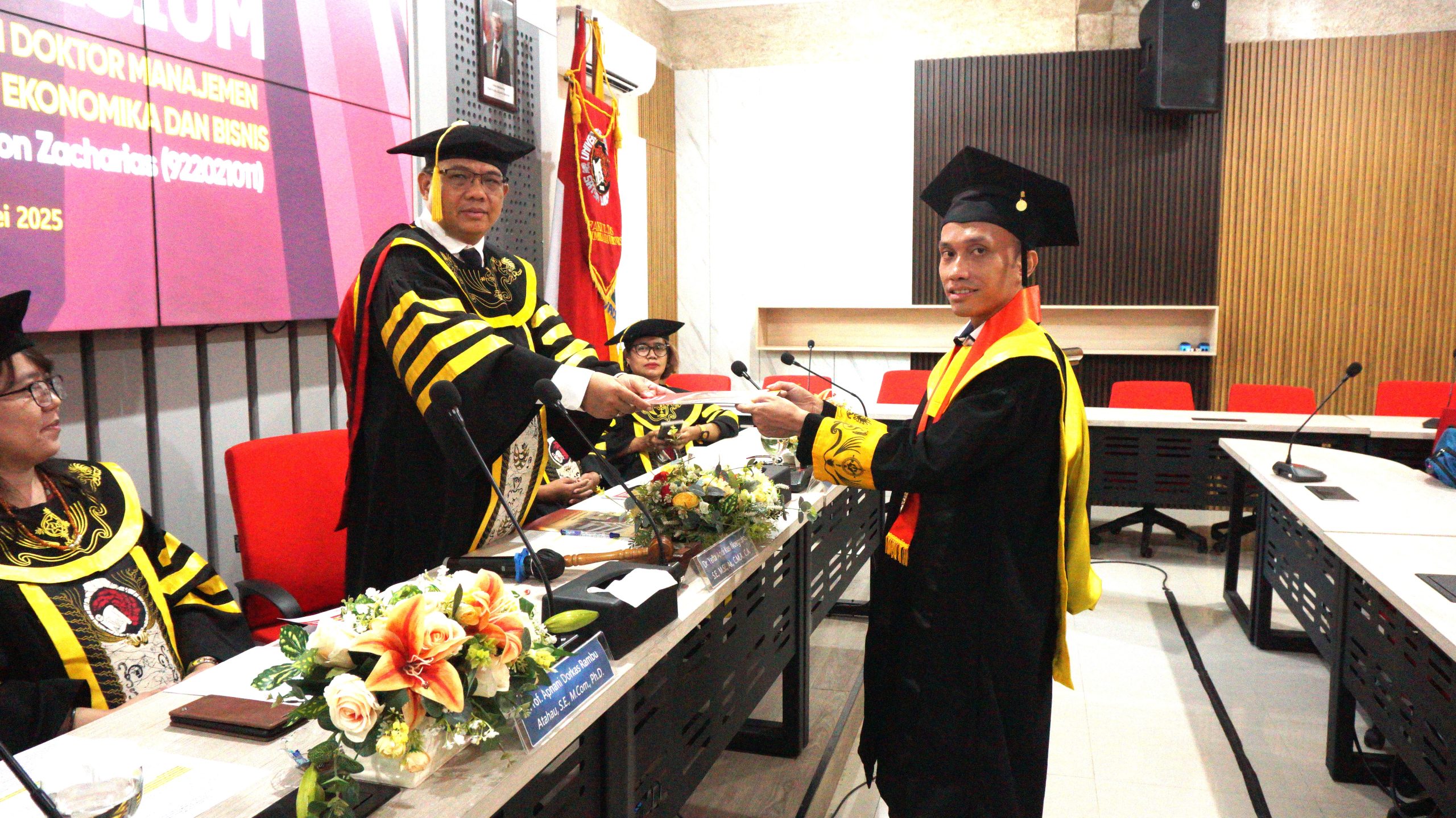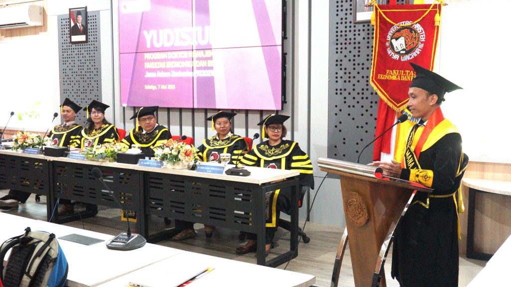 Fakultas Ekonomika dan Bisnis Universitas Kristen Satya Wacana (FEB UKSW) kembali melahirkan doktor baru dalam bidang Ilmu Manajemen. Dalam prosesi yudisium Program Doktor Manajemen yang diselenggarakan pada Rabu, (07/05/2025), Dr. Jems Arison Zacharias, M.Si., S.E., resmi dikukuhkan sebagai doktor setelah berhasil mempertahankan disertasinya yang berjudul “Disagregasi Laba dengan Model Akrual Komprehensif untuk Meningkatkan Relevansi Nilai Laba Negatif.”